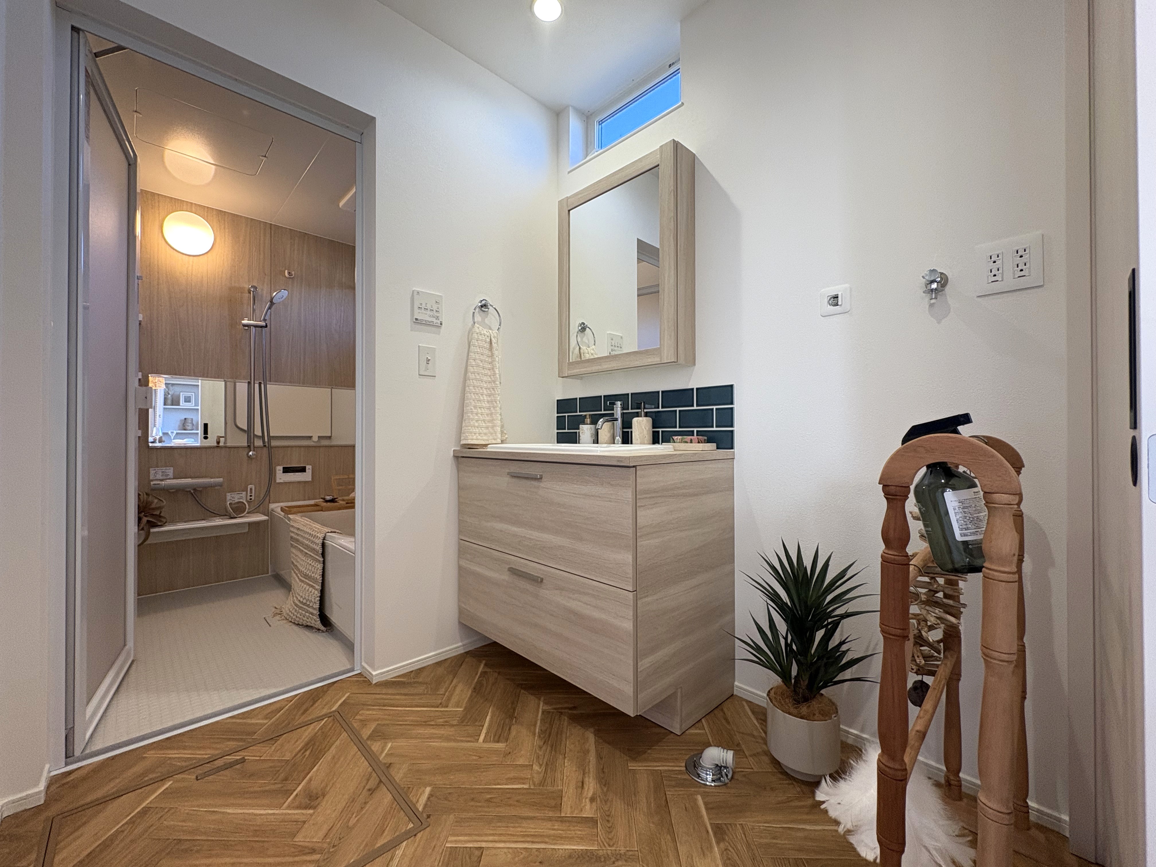 玄関からお風呂場へ直行できる動線は、汚れや花粉を室内に持ち込まないための工夫です。