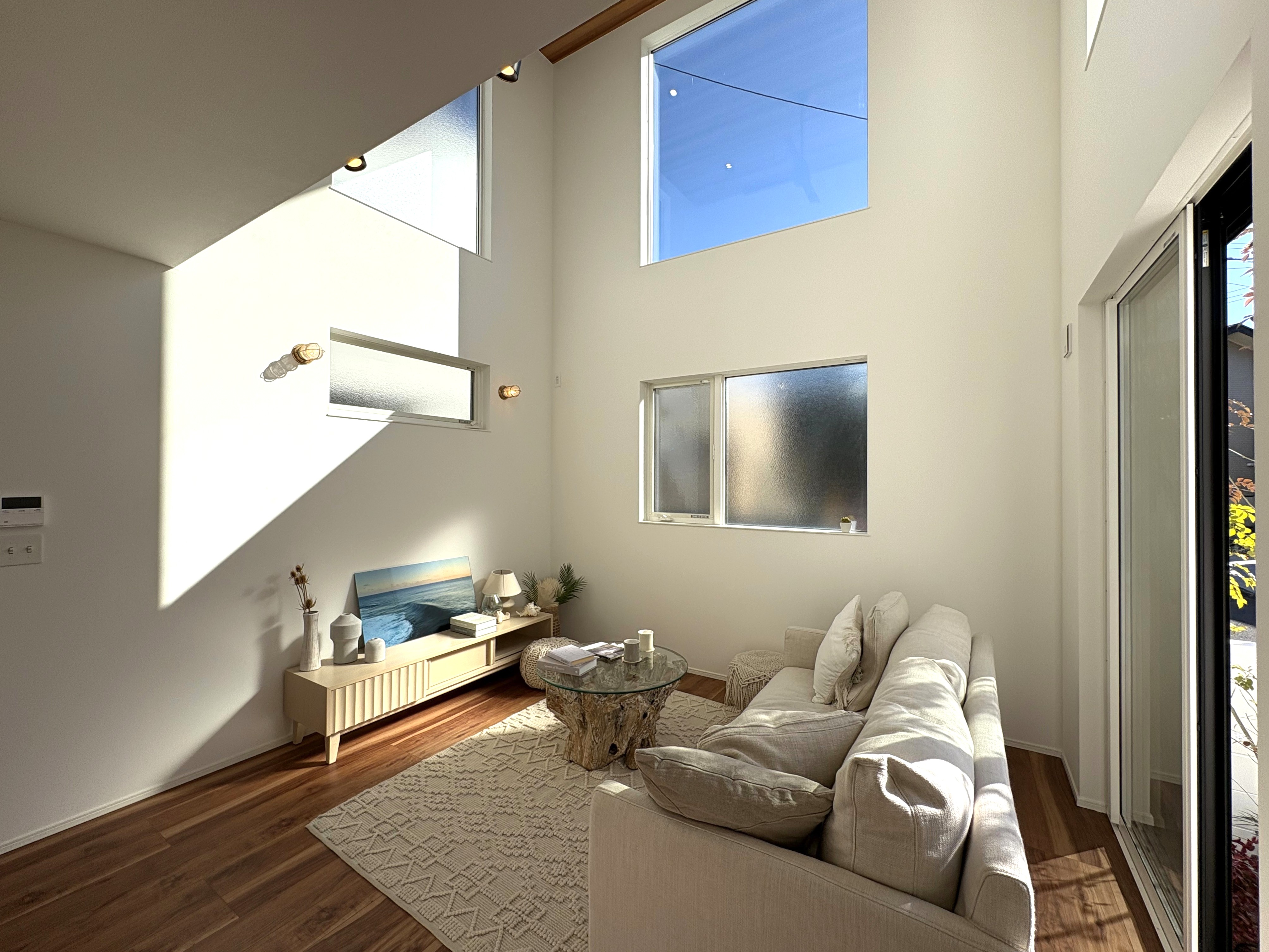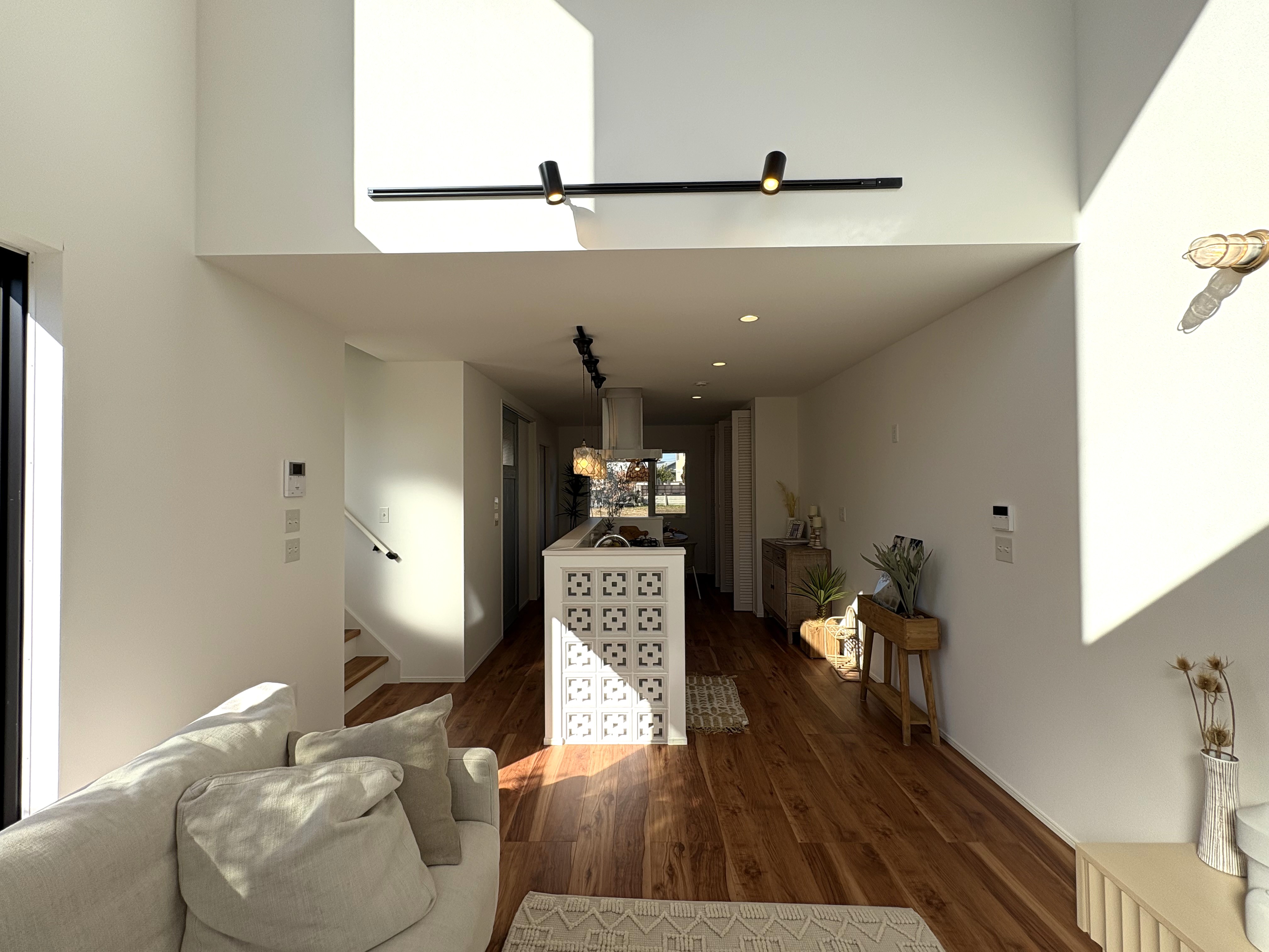 リビングはシーリングファンを備えた吹き抜け構造となっており、高窓から差し込む光が明るく開放的な空間を作り出します。