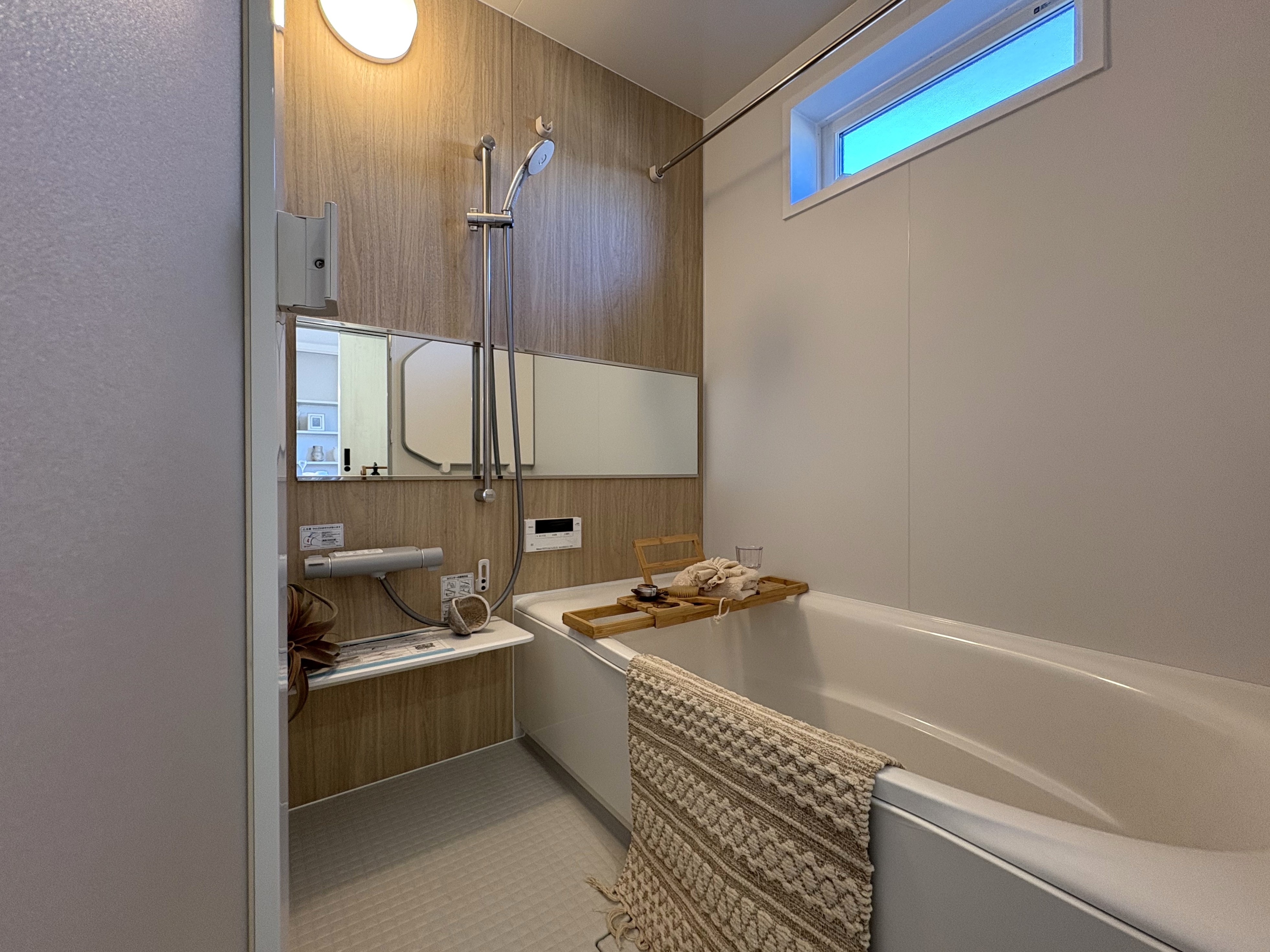 上部吹き抜けのリビング、外部温水シャワー等、
