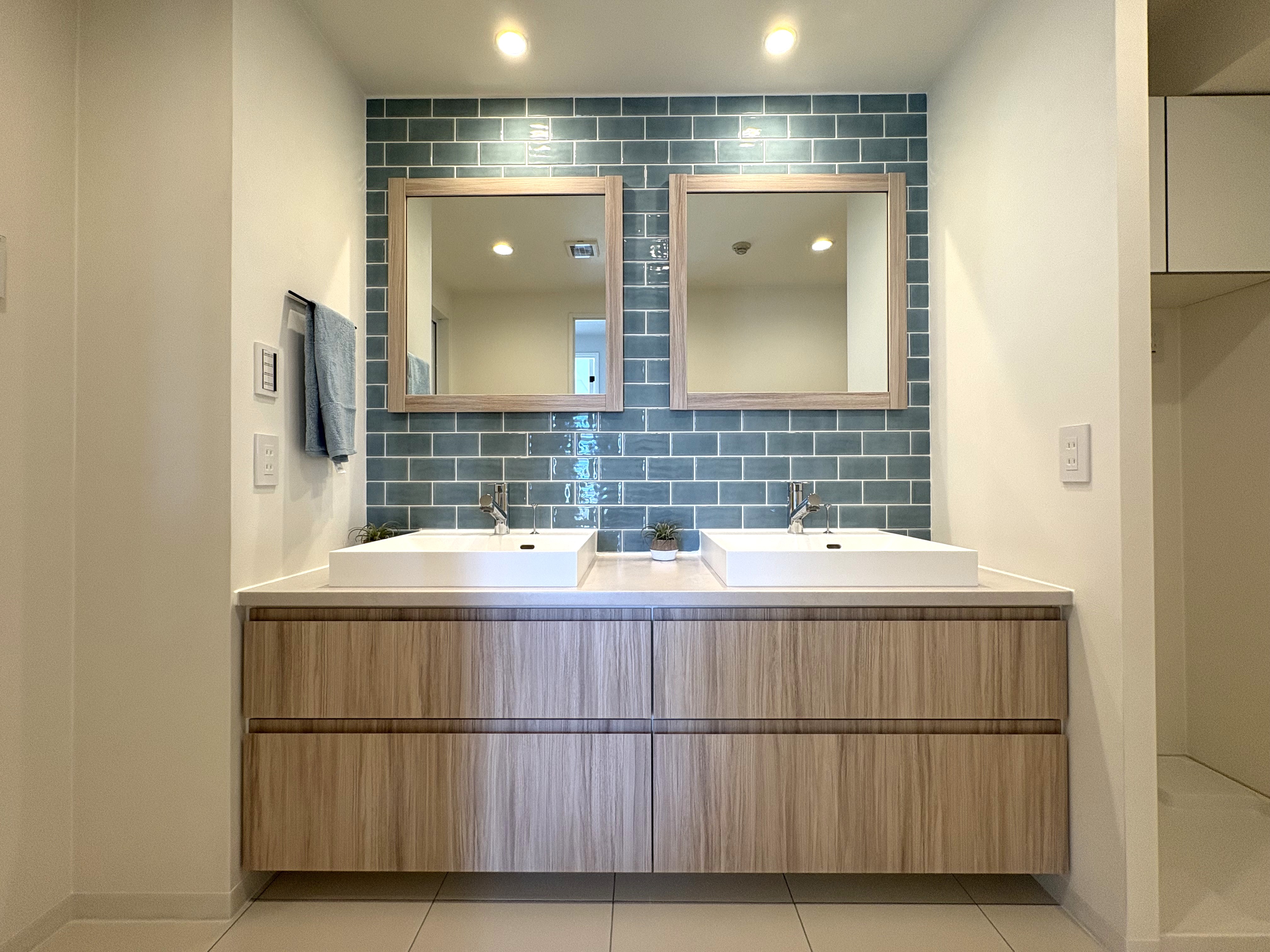 二人が並んでゆったりと身支度ができるダブルボウルの洗面化粧台。