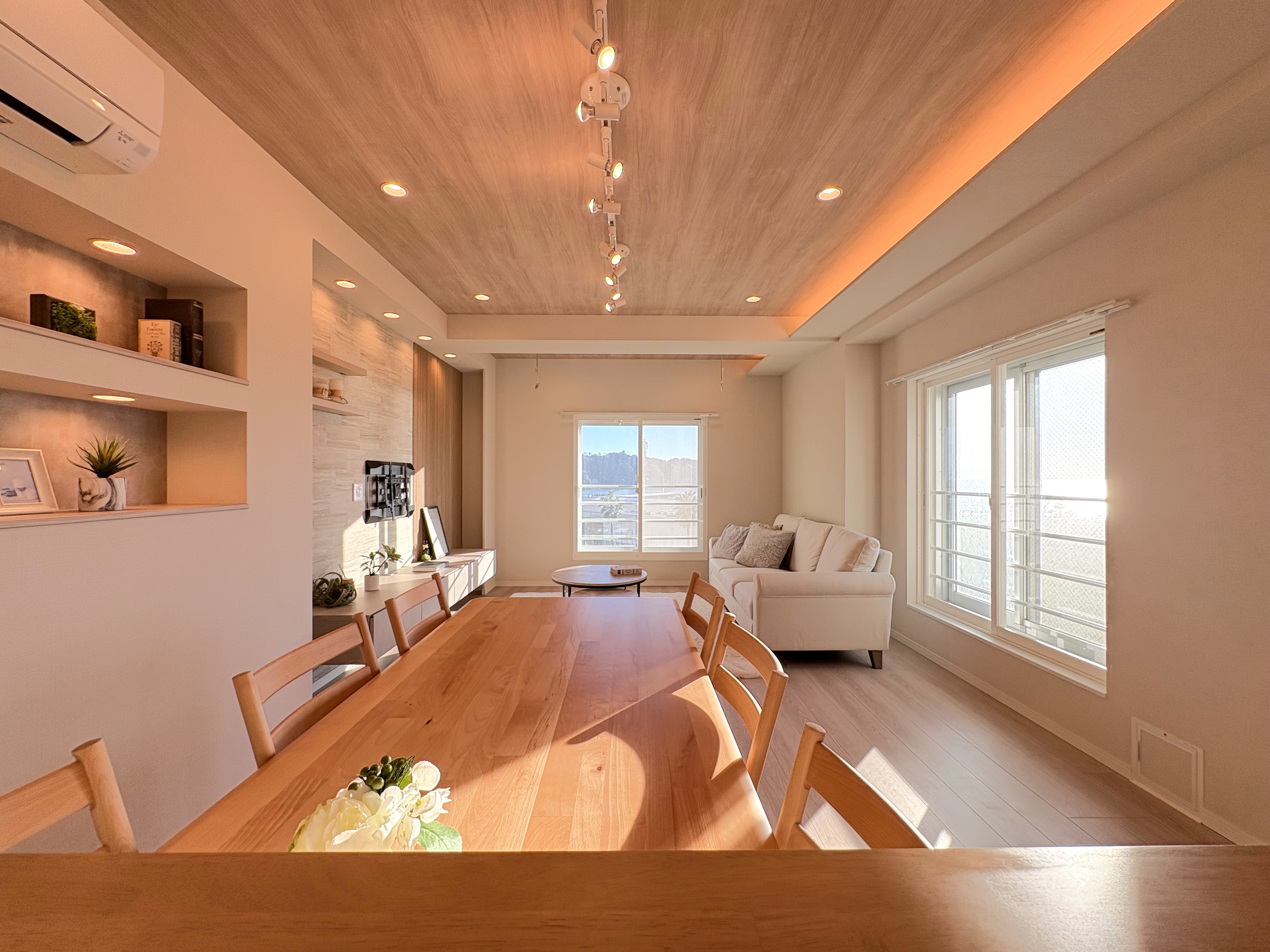 約18.8帖の広々としたLDKは、ナチュラルな木目とデザインが調和したリノベーション空間。