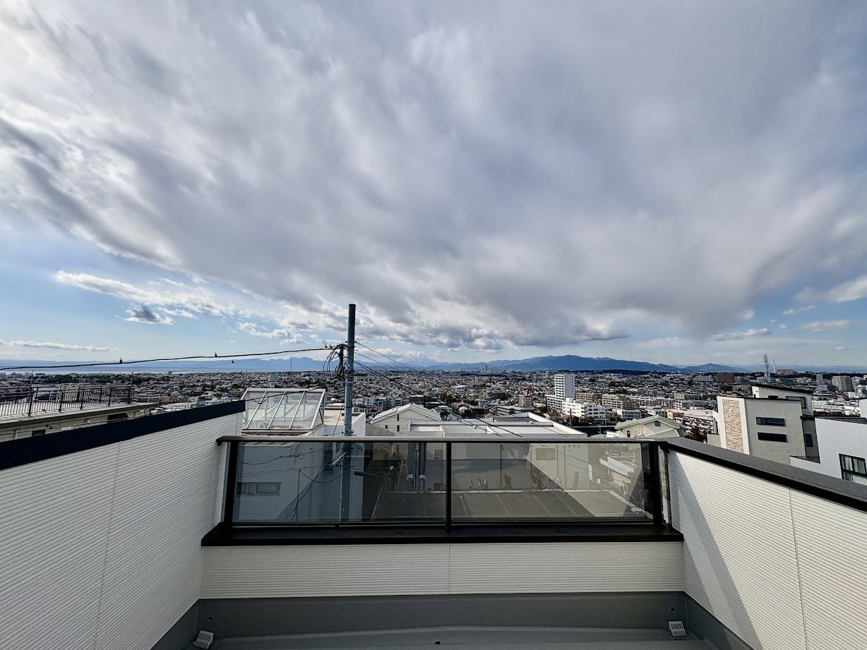 ゆとり室内からさらにルーフバルコニーへ上がると、空・天気が良いと富士が目の前に移ります。