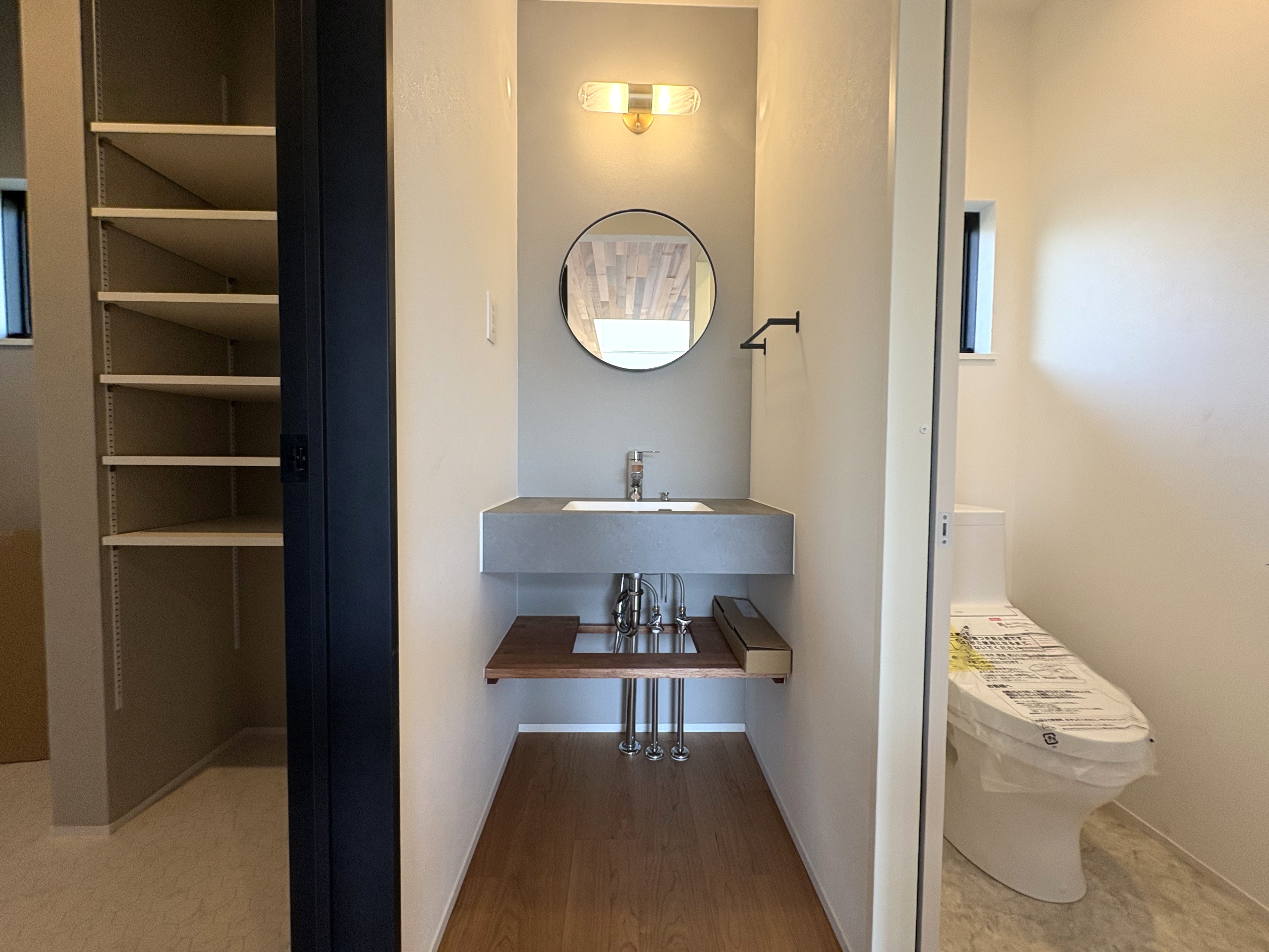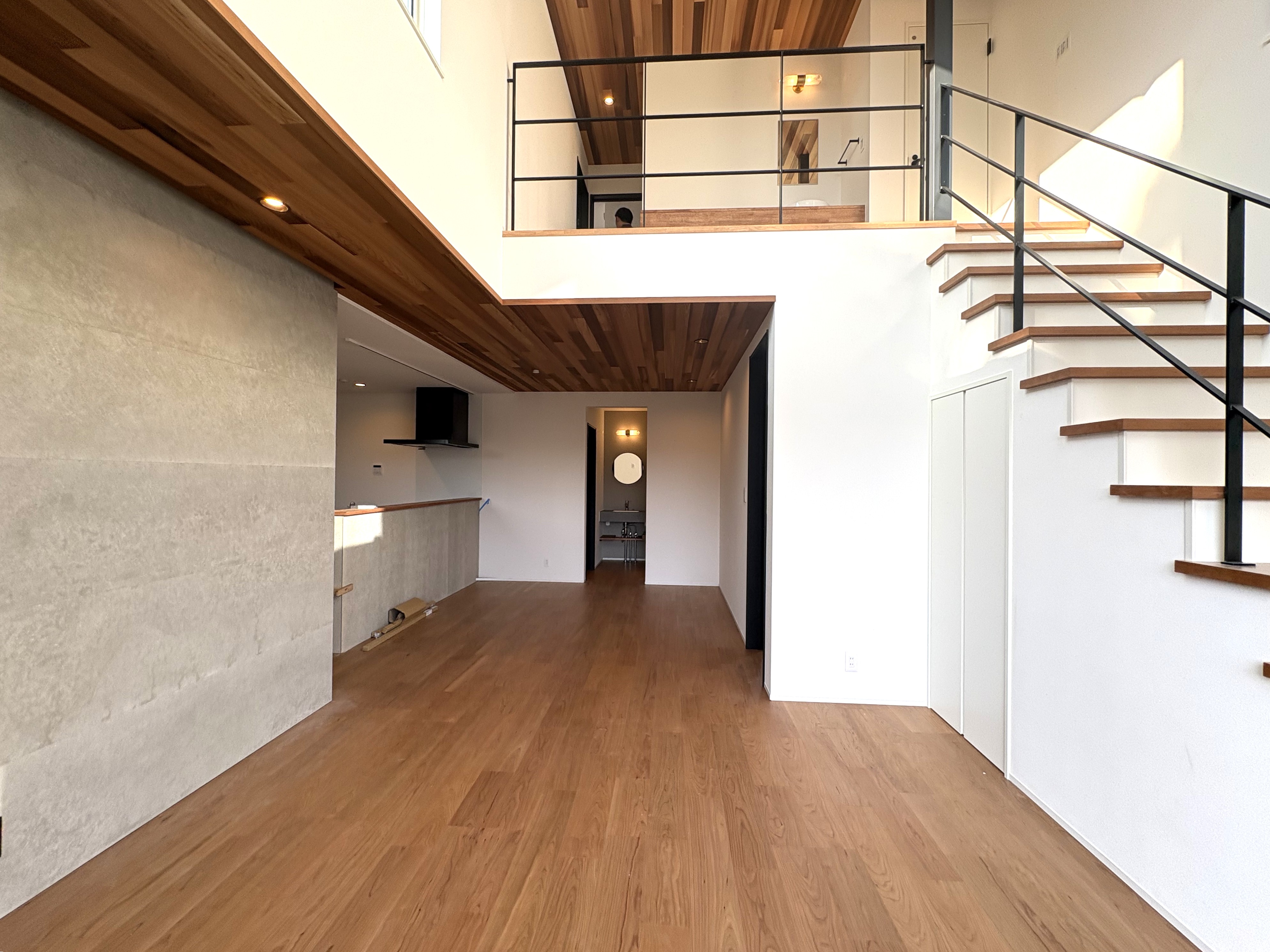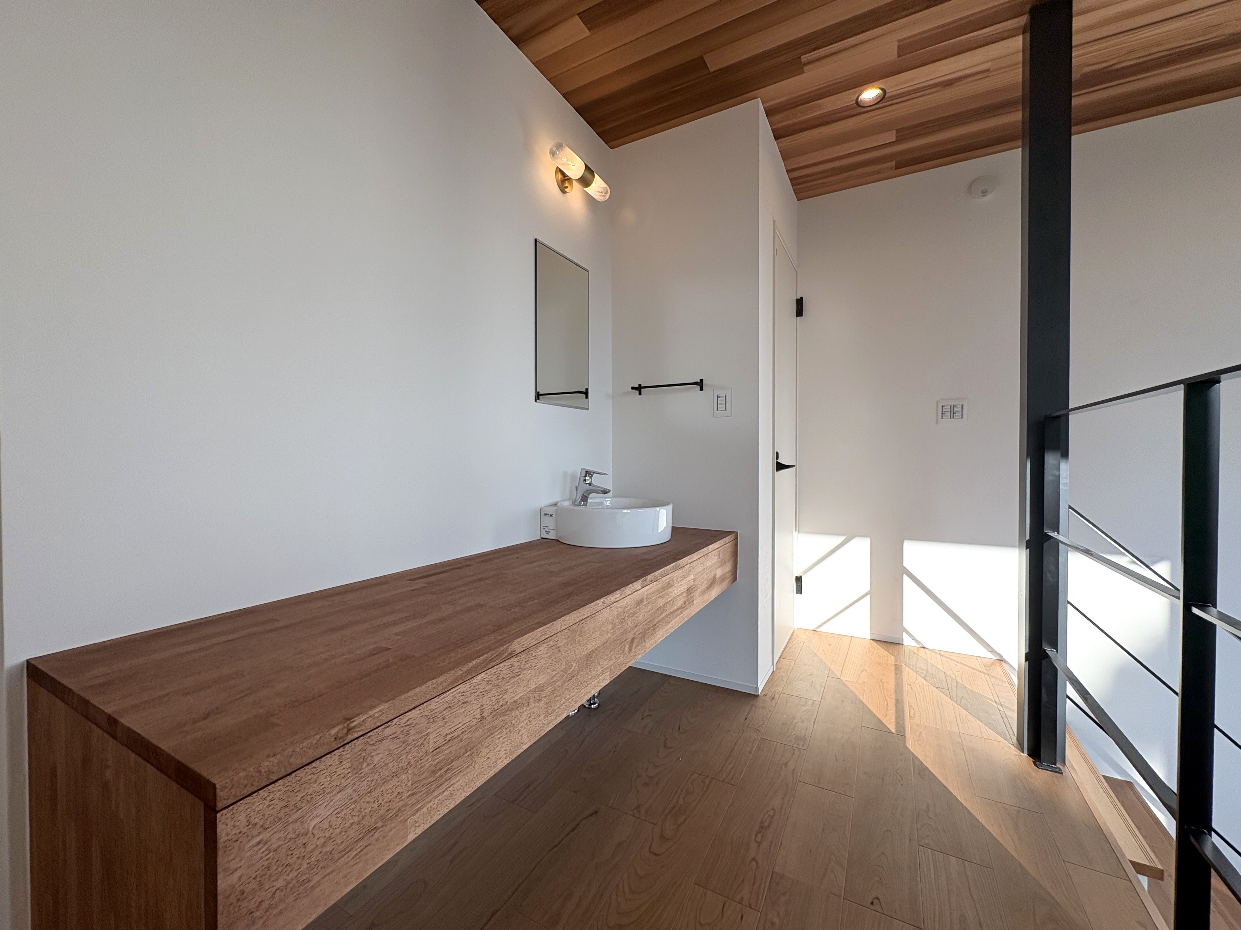 階段を上がった先に便利な洗面台やワークスペースが配置されています。