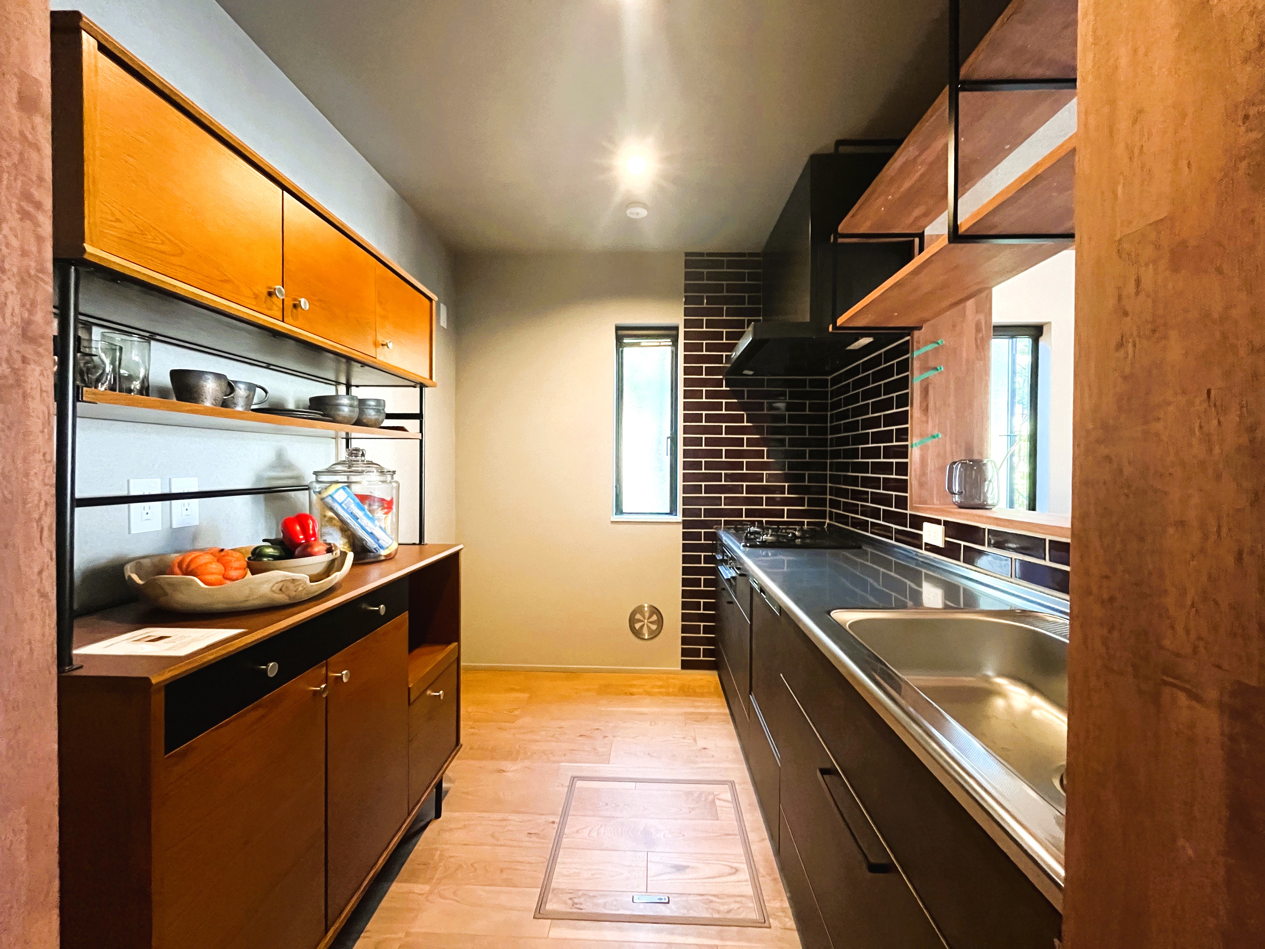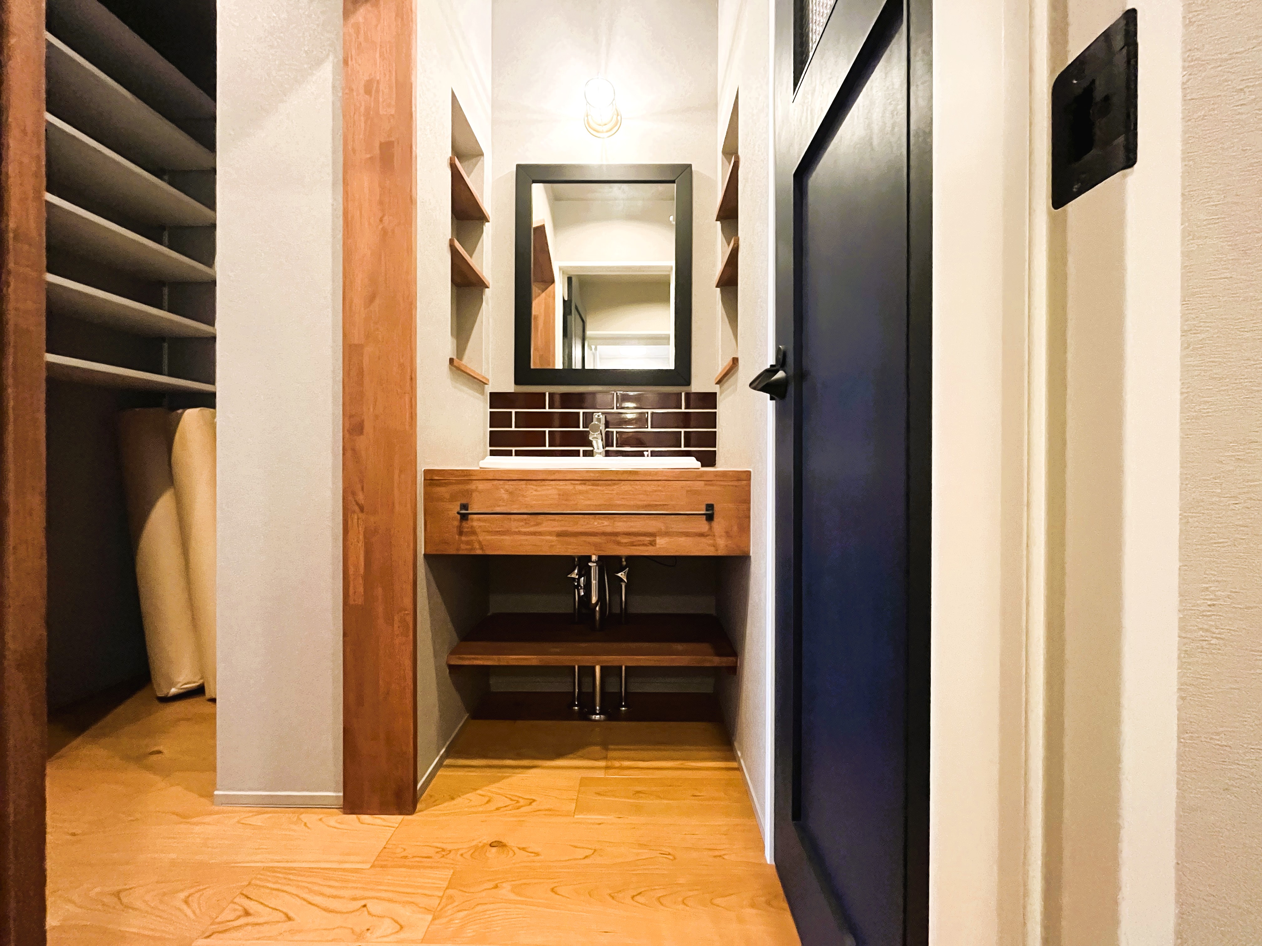 室内には、落ち着いた色合いと質感のある建具を採用。空間に自然なあたたかみと重厚さが感じられ、毎日の暮らしにやさしくなじみます。