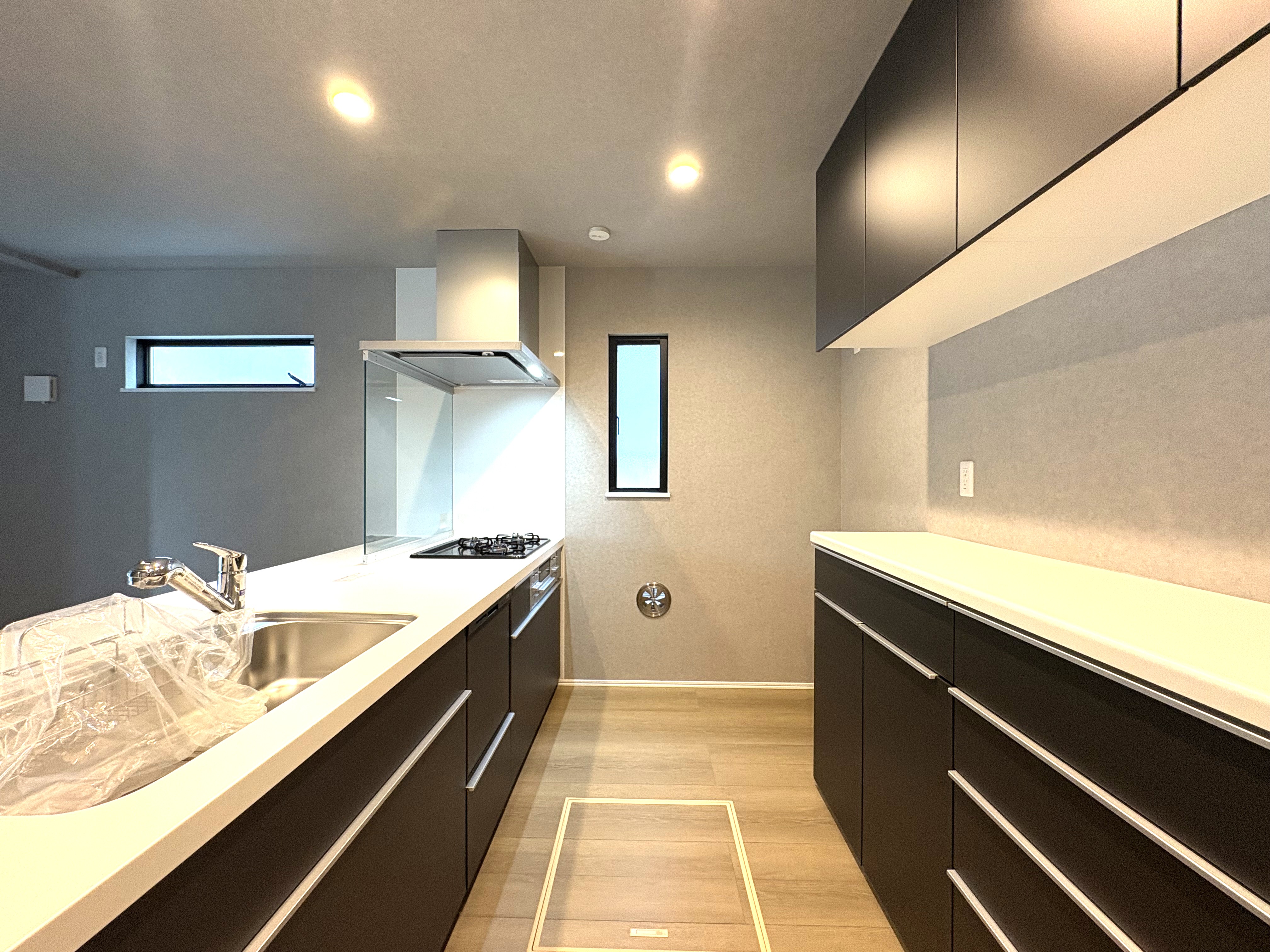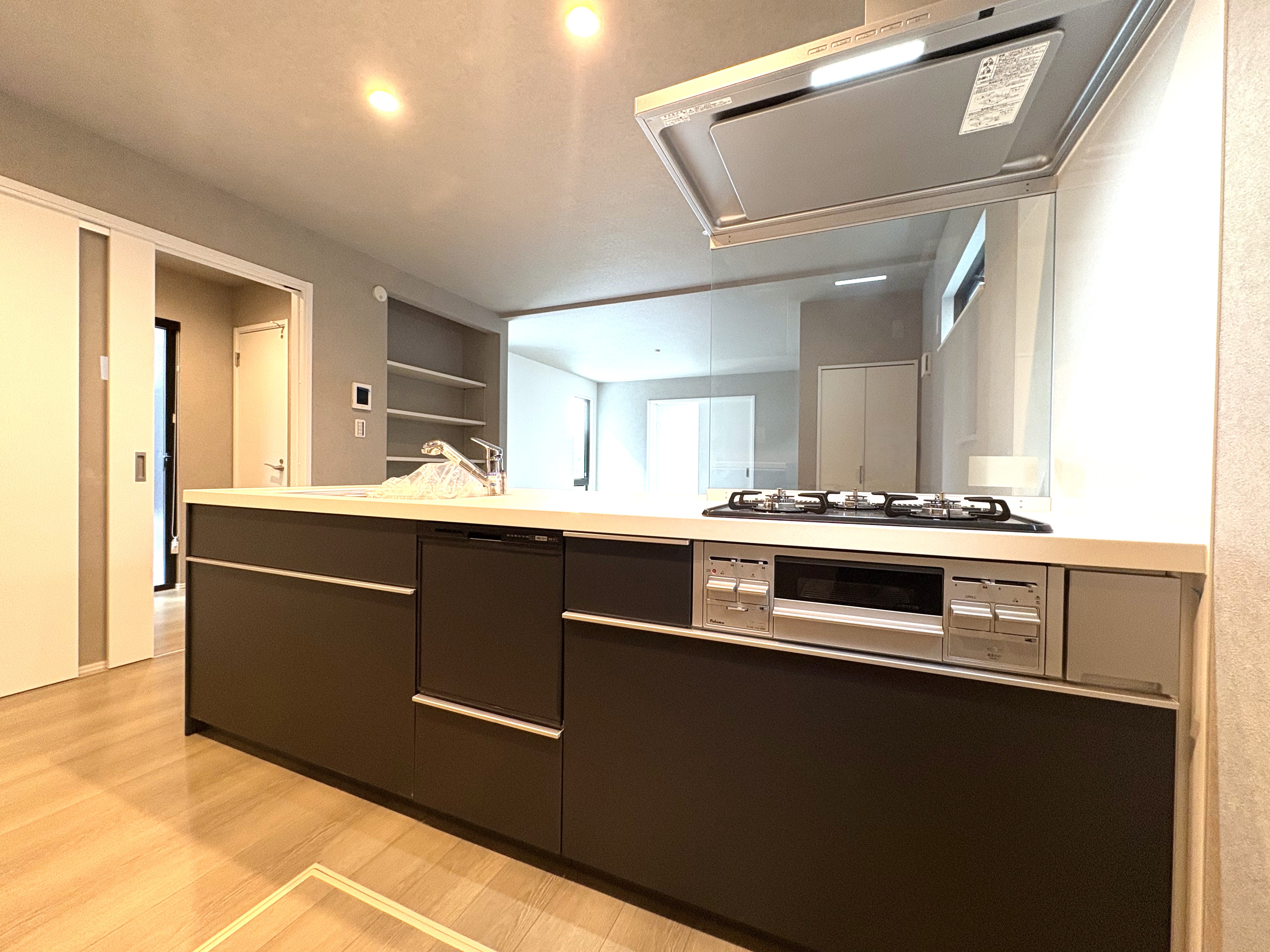 キッチンは、ご家族との会話が弾むカウンターオープン式のシステムキッチン(食洗機付き)。 背面には備え付けのカップボードがあり、生活感を隠してキッチン全体に統一感をもたらします。