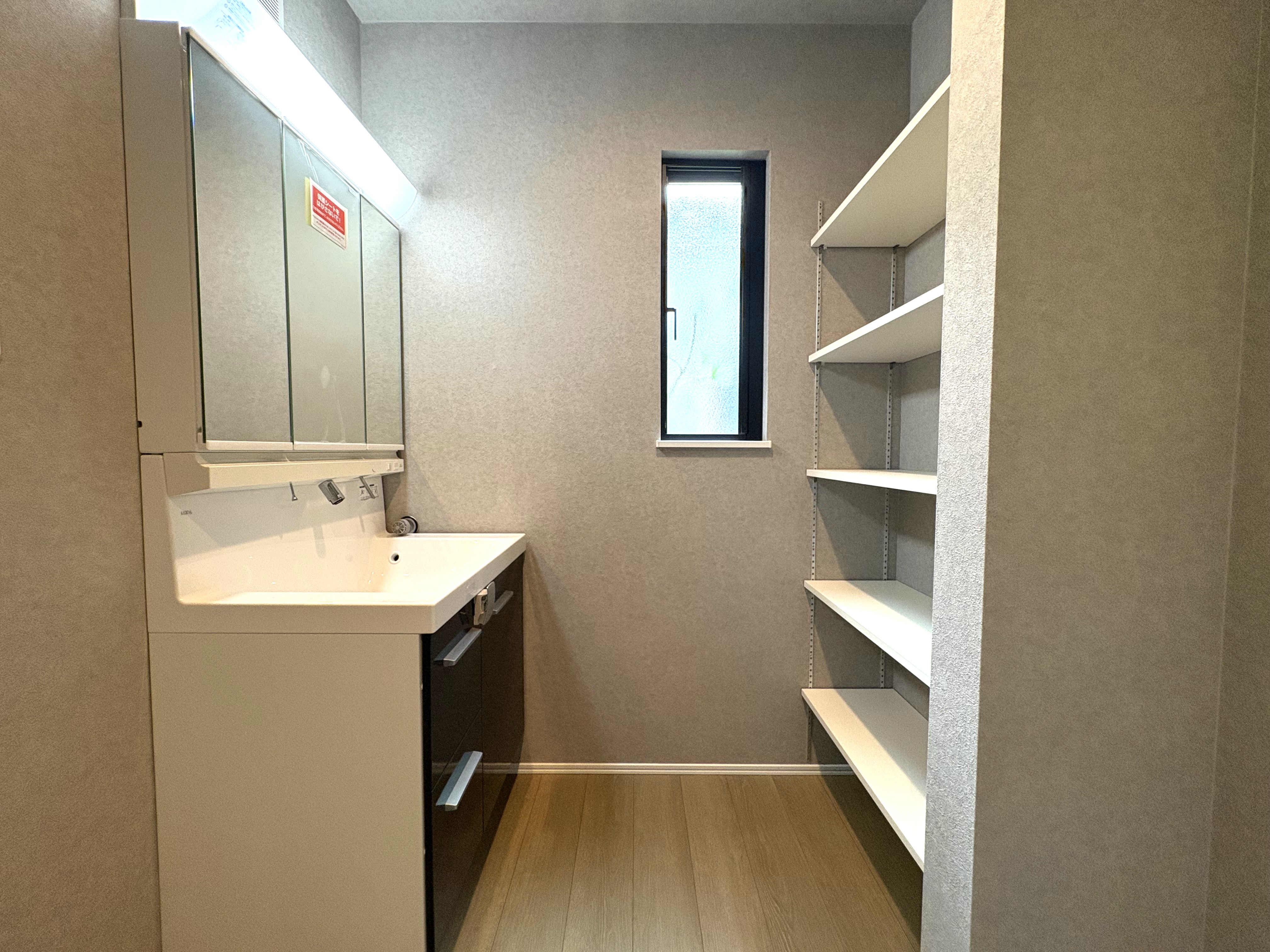 水回り設備を1階に集約することで、家事動線にも配慮しました。 洗面室には、バスタオルなどの収納に便利な可動棚があり、更に裏庭へ出られる勝手口が付いています。採光と換気が可能な窓付きのバスルームは、毎日の疲れを癒す快適な空間です。