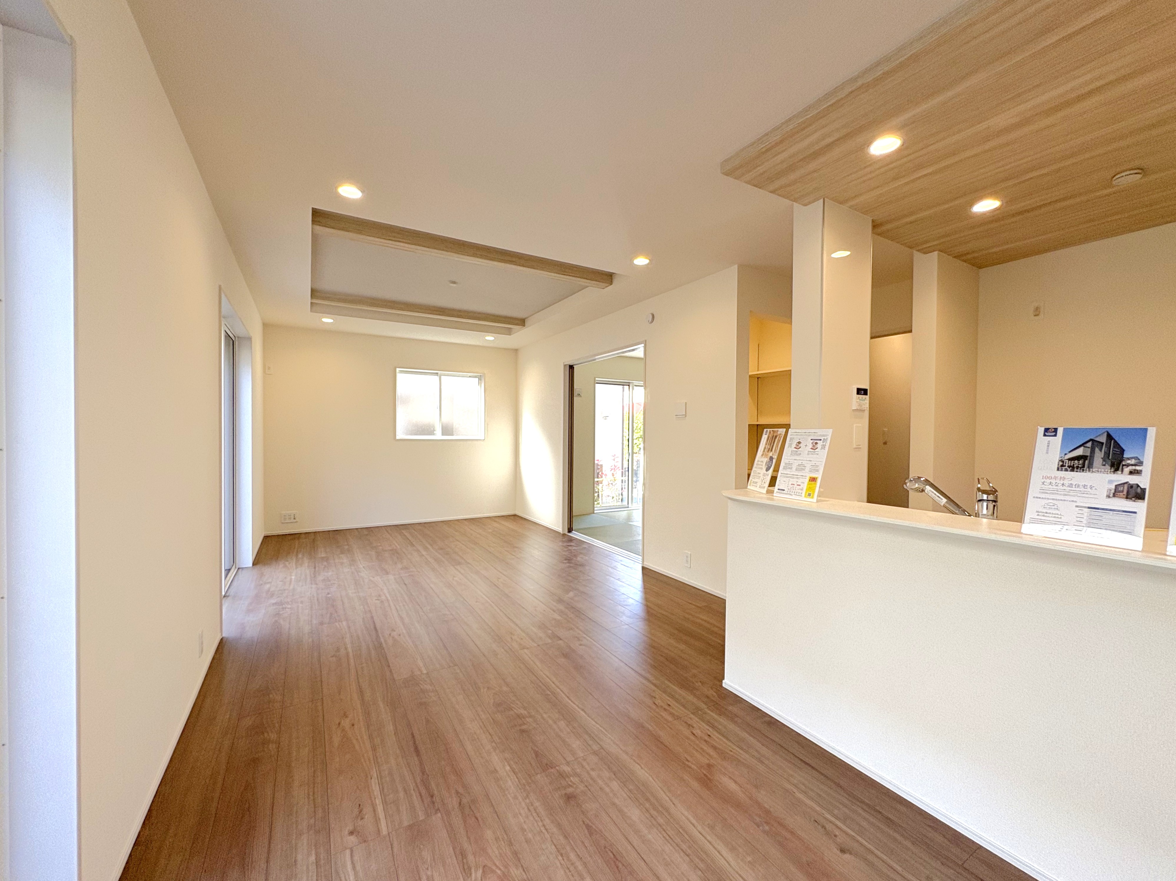 約18.62帖の広々としたLDKには、空間をより高く見せる「折上天井」が採用されています。