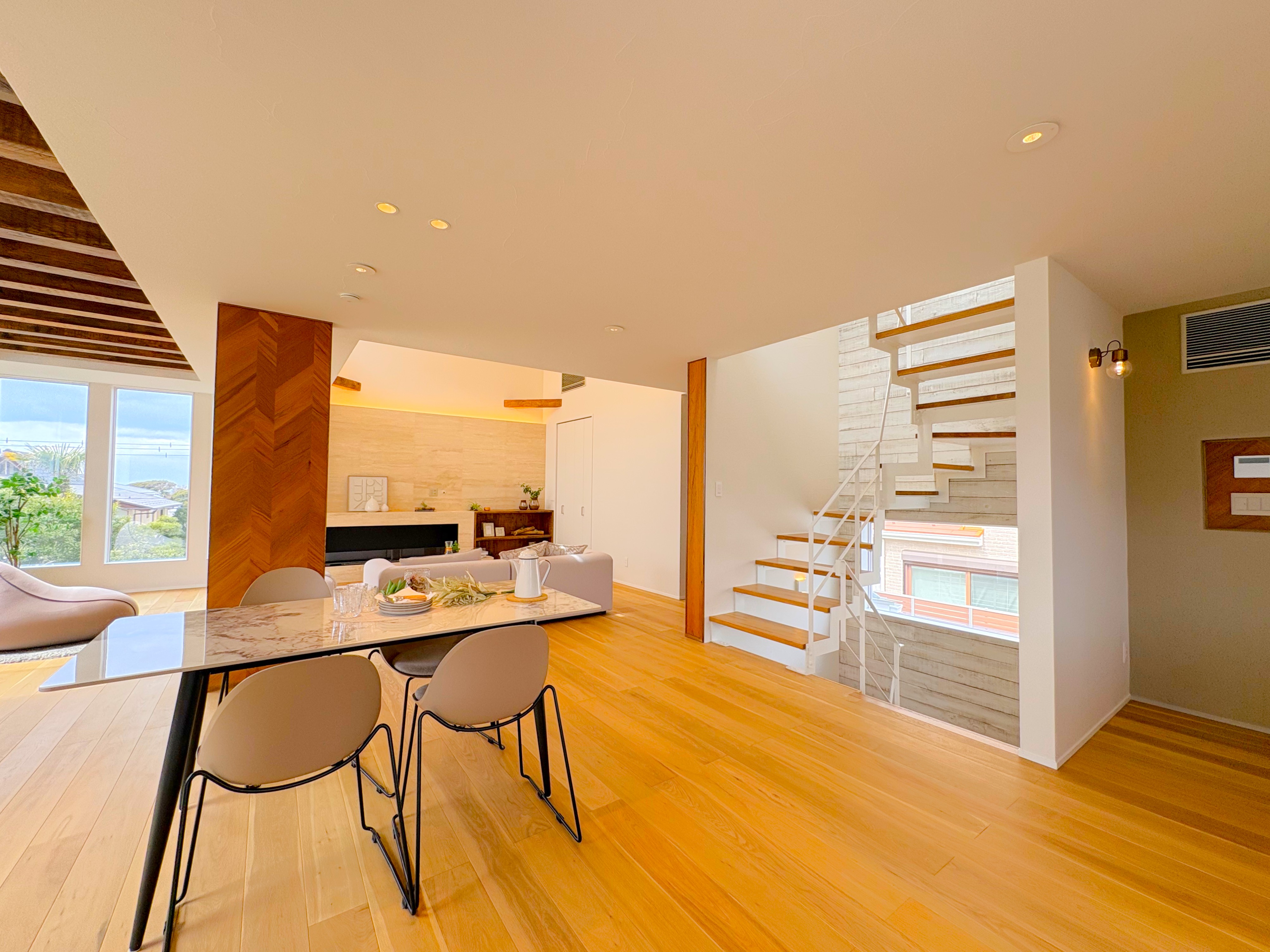 2階に広がる約39帖もの大空間LDKは、吹抜け天井がさらなる開放感を演出し、南側から差し込む柔らかな光が住まい全体を明るく照らします。