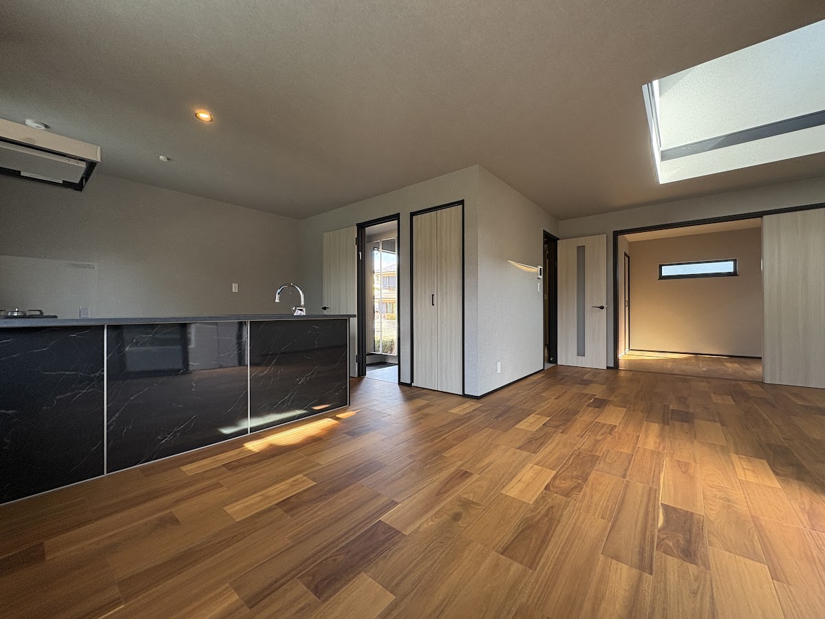 ■ 家族の時間を彩る17.9帖のLDKと吹き抜け 建物面積は約110.02㎡(約33.28坪)という堂々たる広さを誇ります。約17.9帖のリビングダイニングキッチンは、上部に吹き抜けを設けることで、圧倒的な開放感と明るさを実現しました