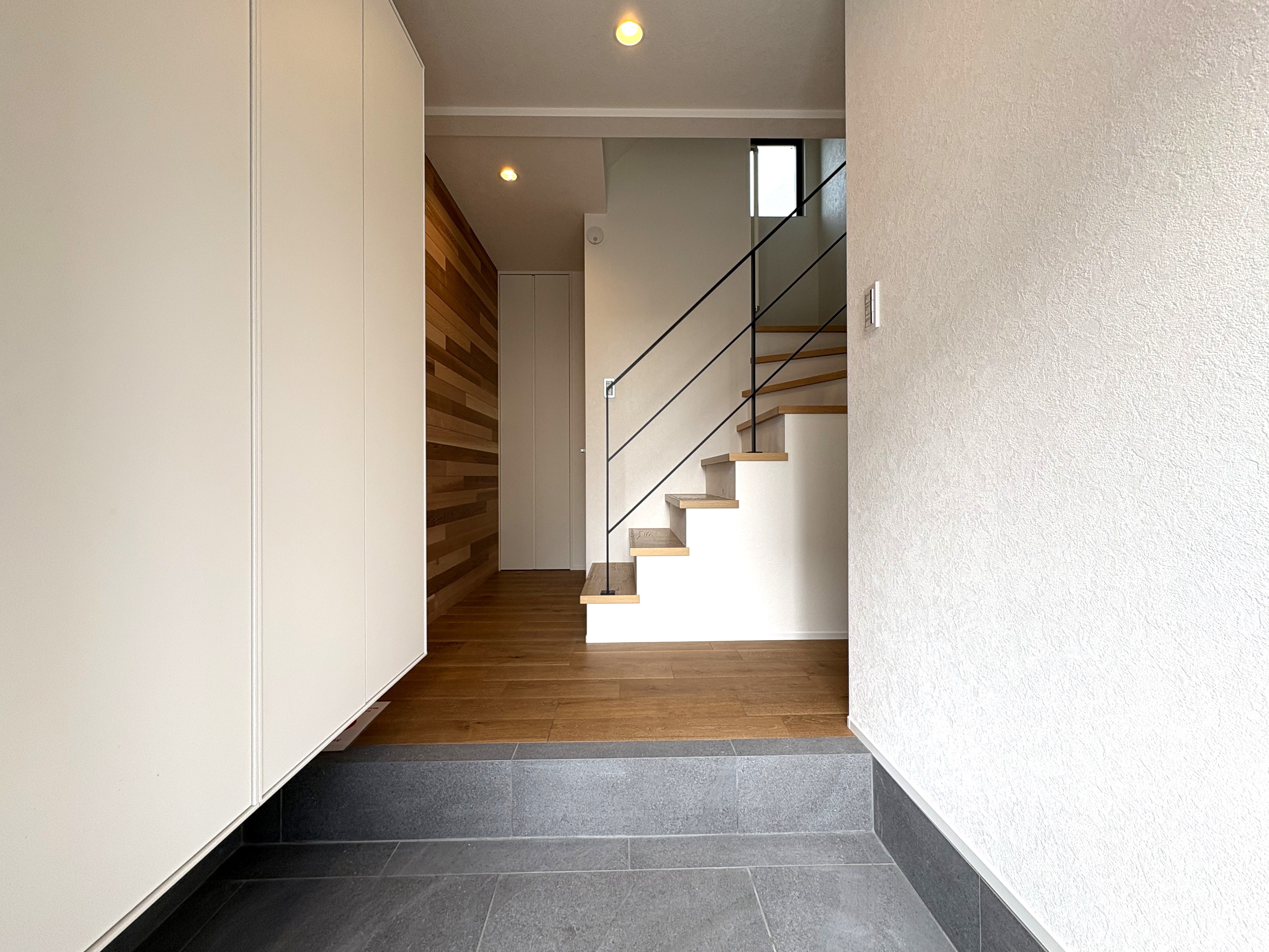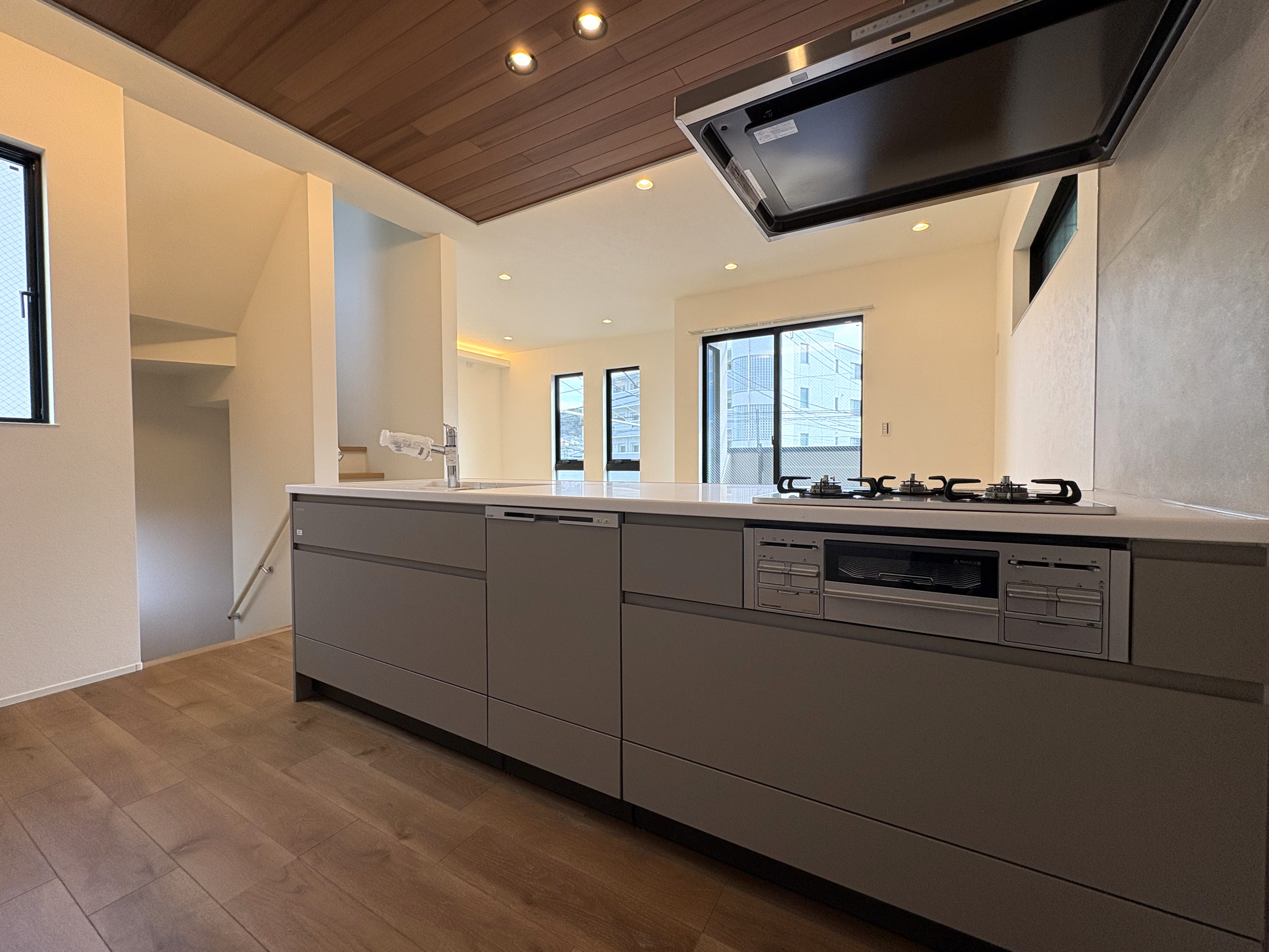 2階に位置するLDKは、天井高2.6mを確保。間接照明とダウンライトが計算し尽くされた配置で、夜には高級ホテルのラウンジを彷彿とさせる静謐な空間へと表情を変えます。キッチンの天井や玄関壁面にも天然木を配し、アクセントには洗練された「名古屋モザイク」の大判タイルを採用。意匠性と居住性が高次元で融合しています。