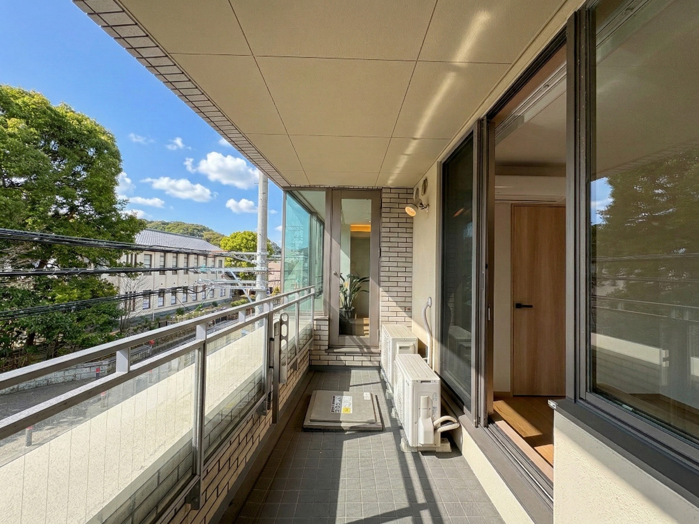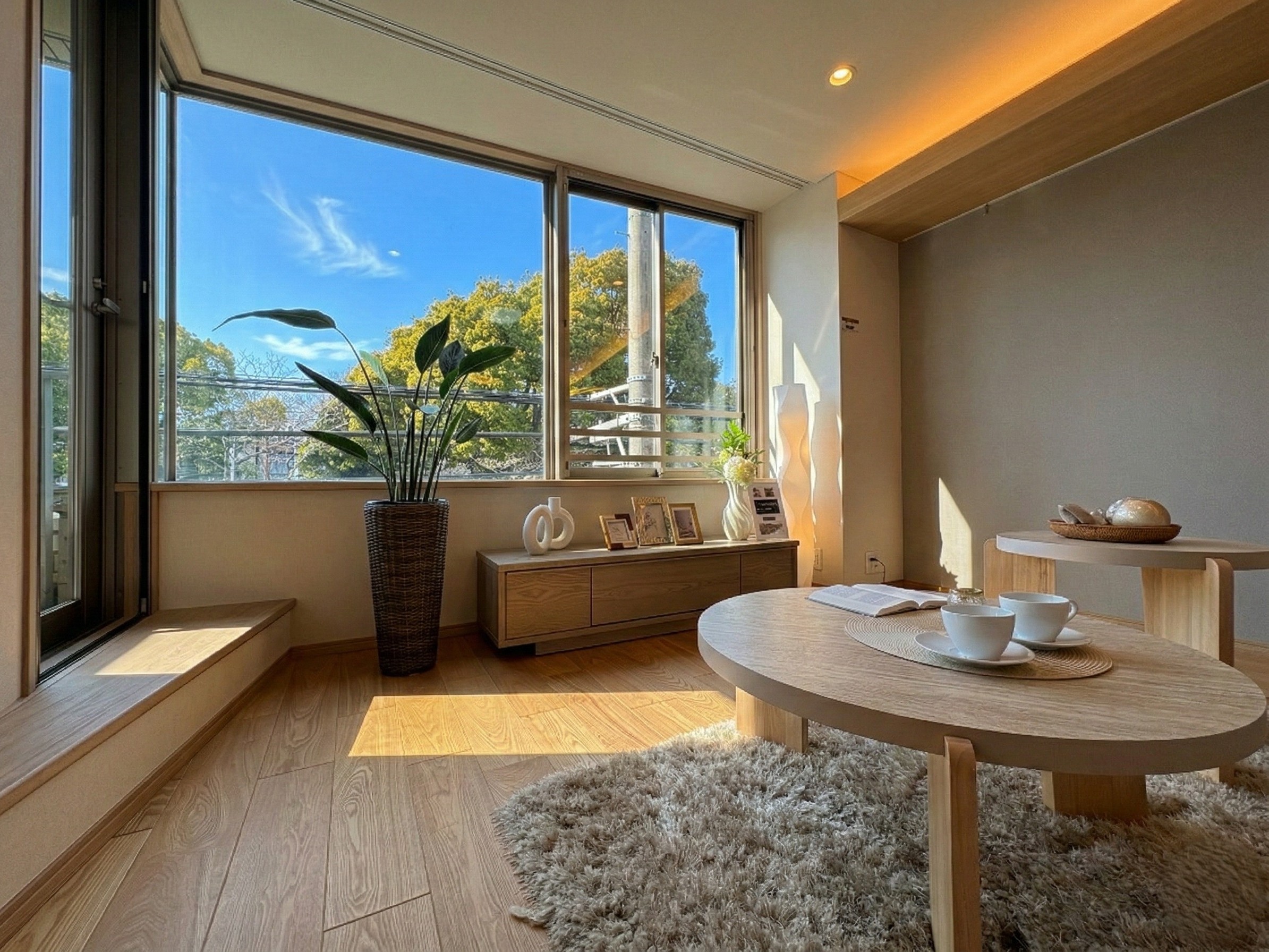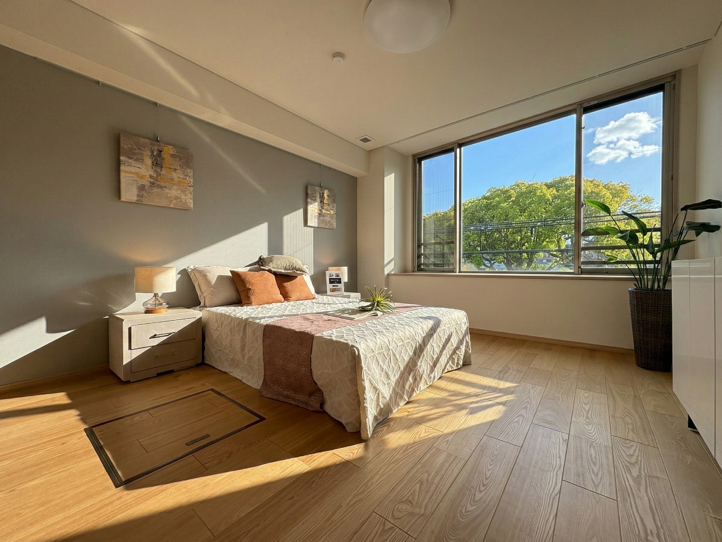 本物件最大の特徴は、リビングや寝室の大きな窓から望む豊かな緑です。周囲の自然をインテリアの一部として取り込む「借景」の設計により、駅近とは思えないほどの静寂と開放感を実現しました。LDKは約22.9帖の広さを誇り、足元には床暖房を完備。柔らかな光が差し込むワイドスパンのバルコニーが、日常にゆとりをもたらします。