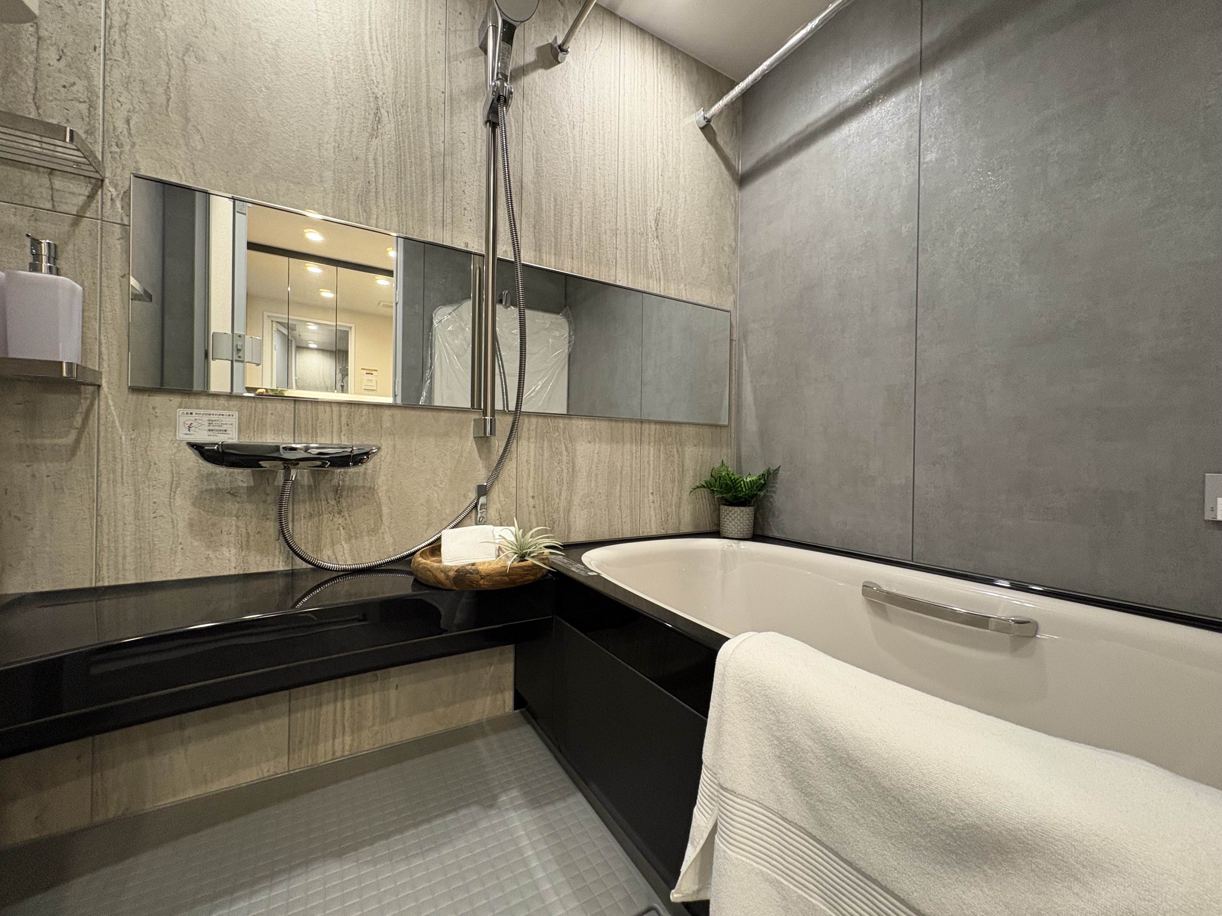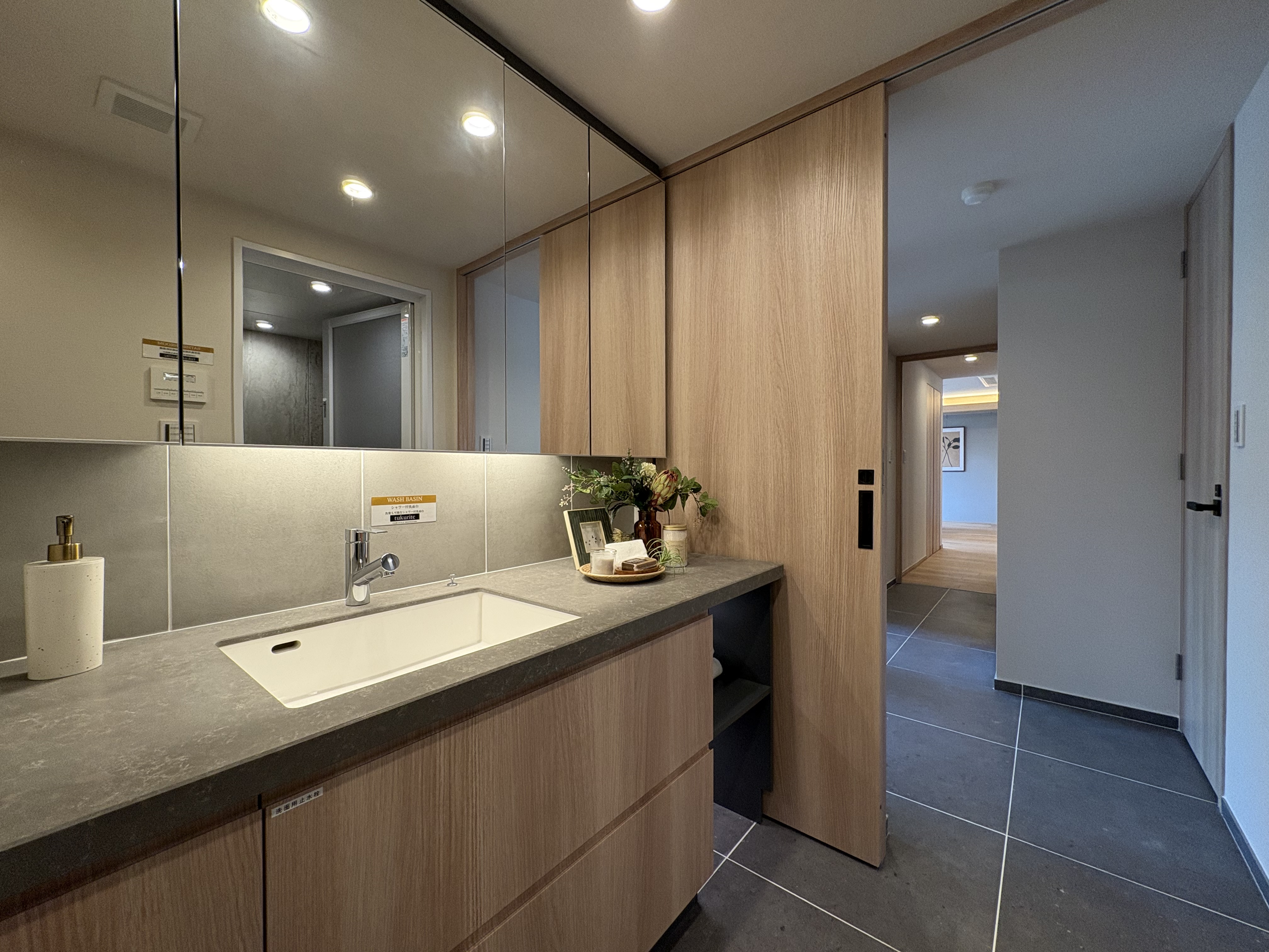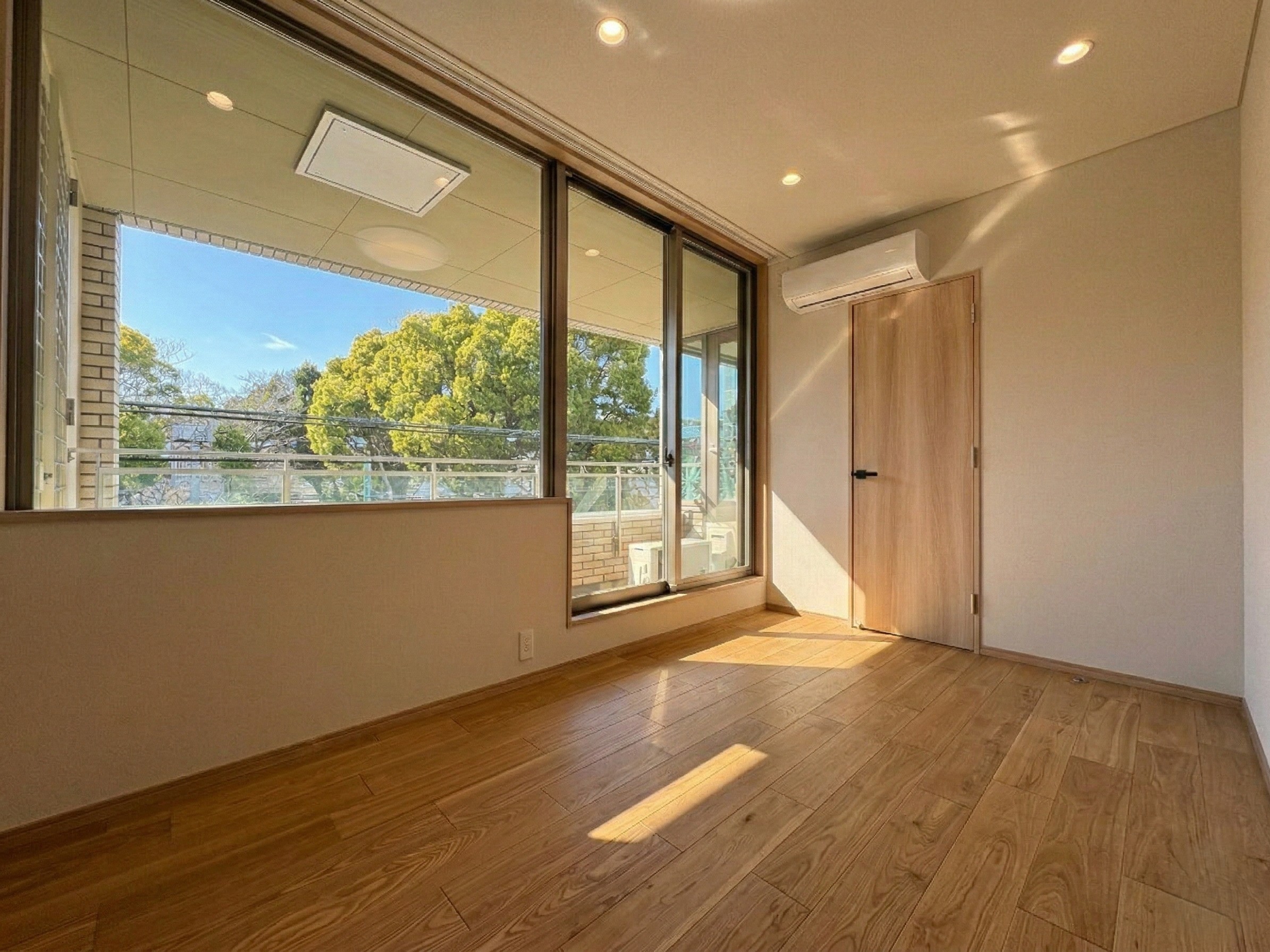 本物件最大の特徴は、リビングや寝室の大きな窓から望む豊かな緑です。周囲の自然をインテリアの一部として取り込む「借景」の設計により、駅近とは思えないほどの静寂と開放感を実現しました。LDKは約22.9帖の広さを誇り、足元には床暖房を完備。柔らかな光が差し込むワイドスパンのバルコニーが、日常にゆとりをもたらします。