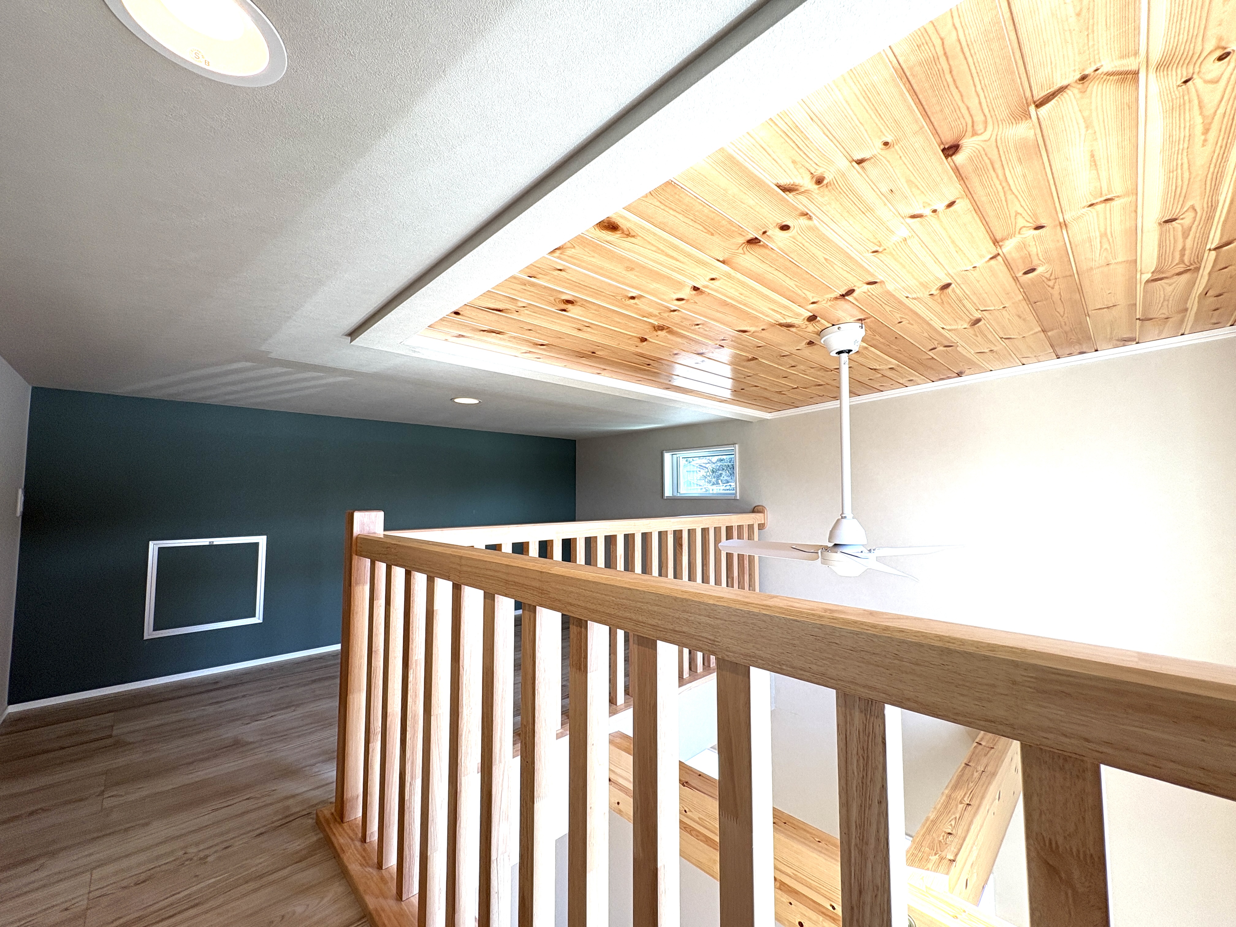 床材には、優しい質感と美しい風合いが魅力の「本桜無垢板」を採用。さらに、天井の一部や玄関ポーチにはパイン無垢板をあしらい、自然素材の温もりに包まれる住まいを実現しています。