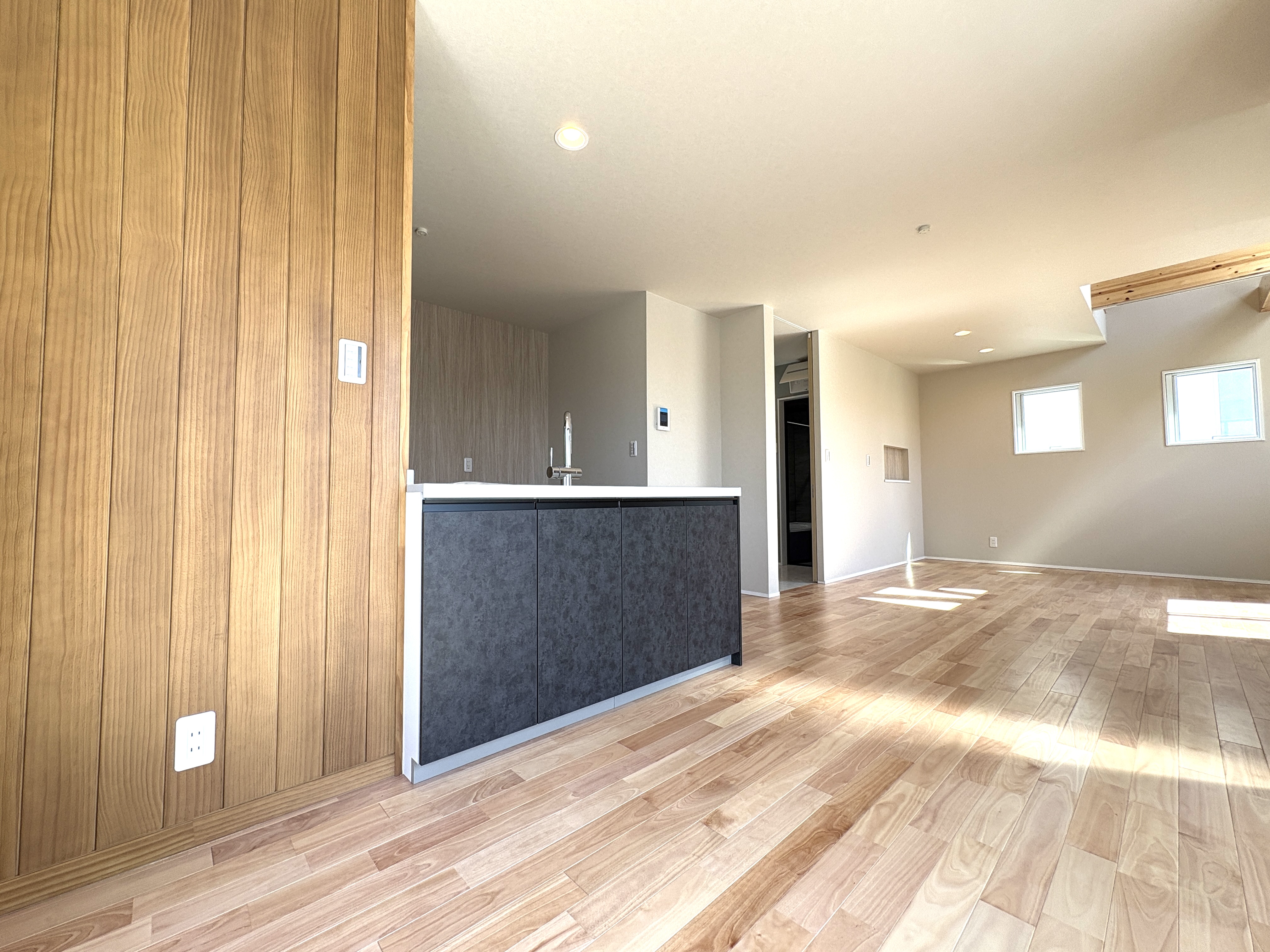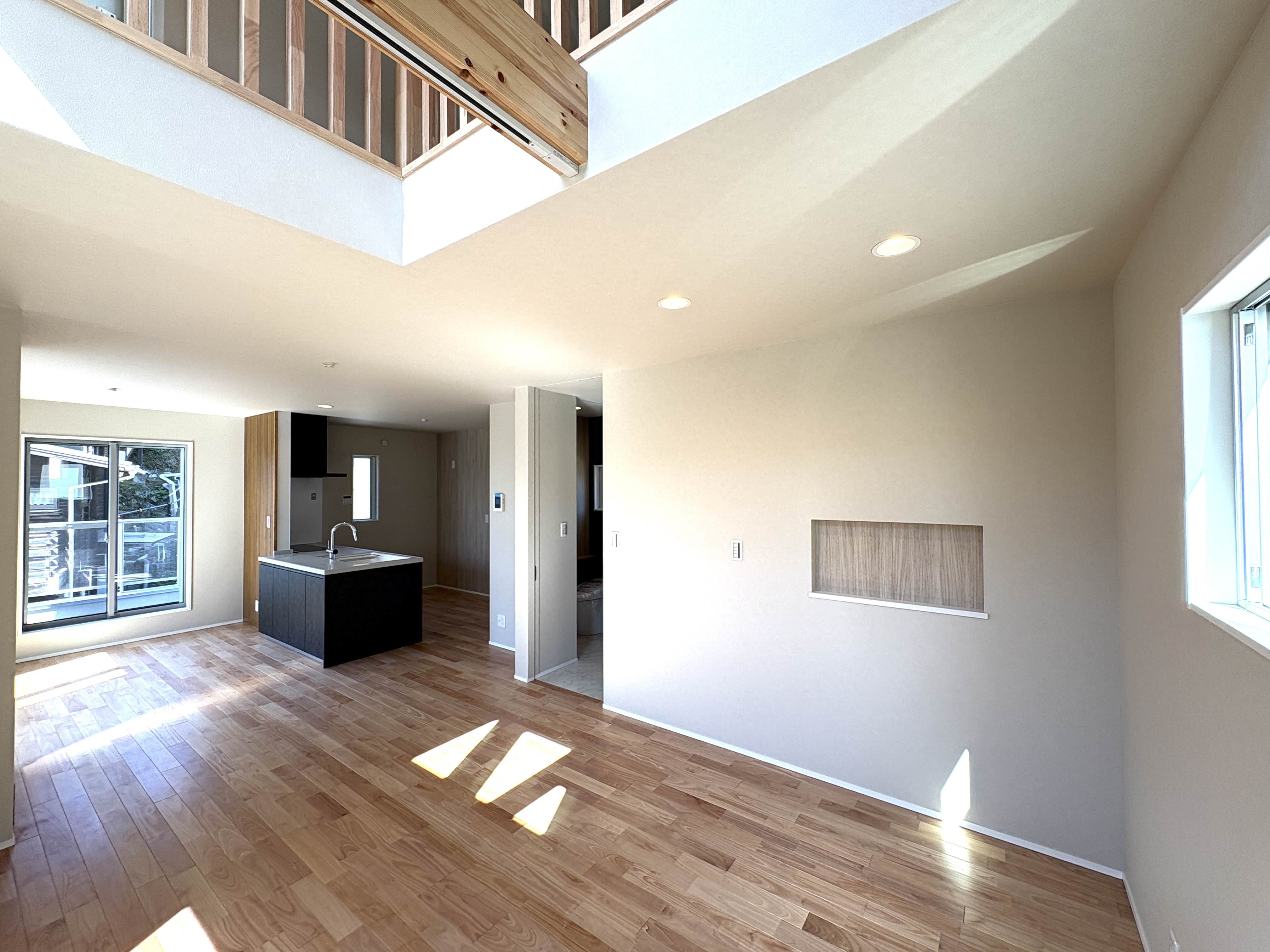 室内は、家族が集うLDKにこだわりを詰め込みました。20帖を超える広々とした空間は、吹き抜け天井による高い開放感が特徴です。