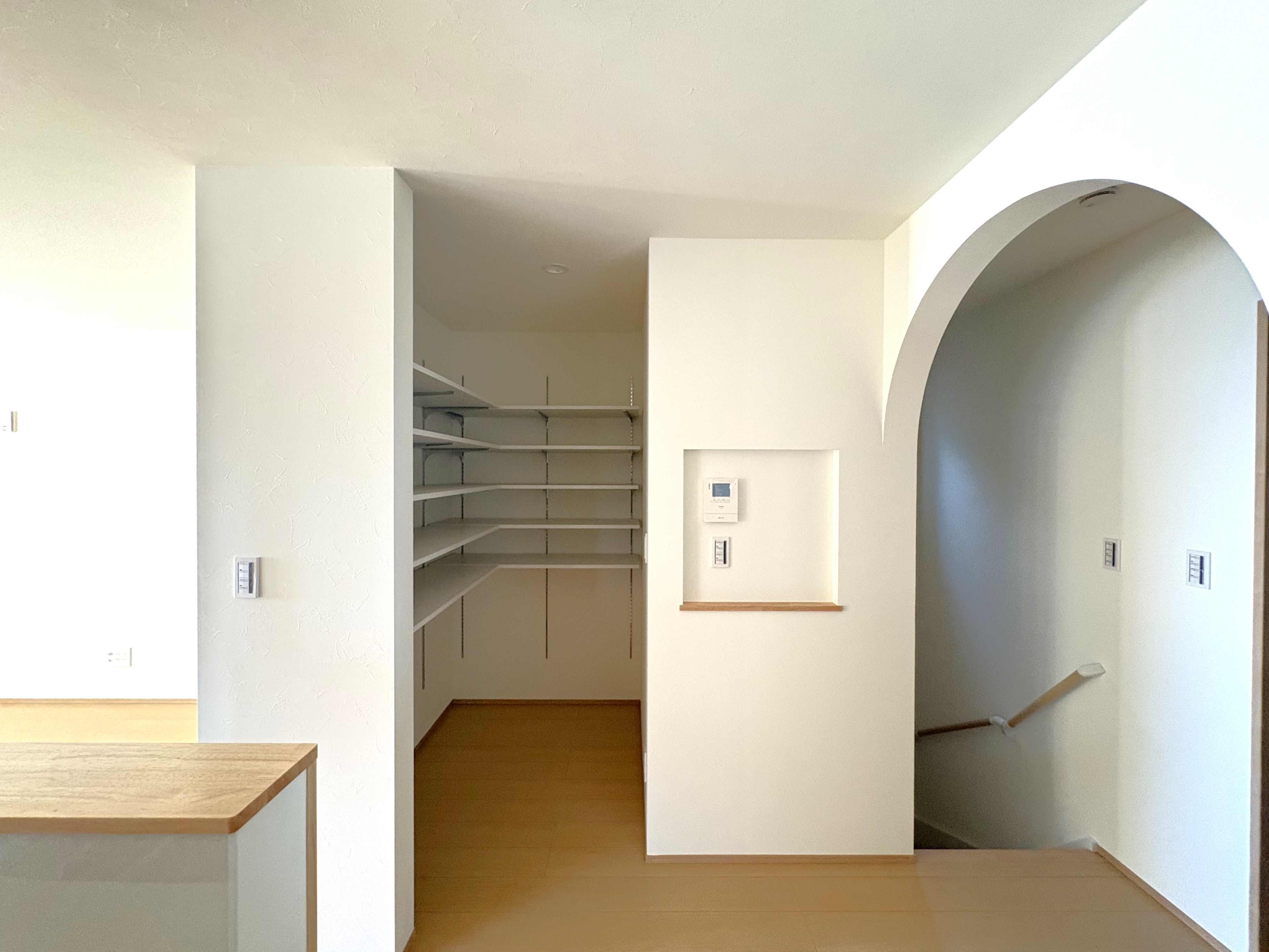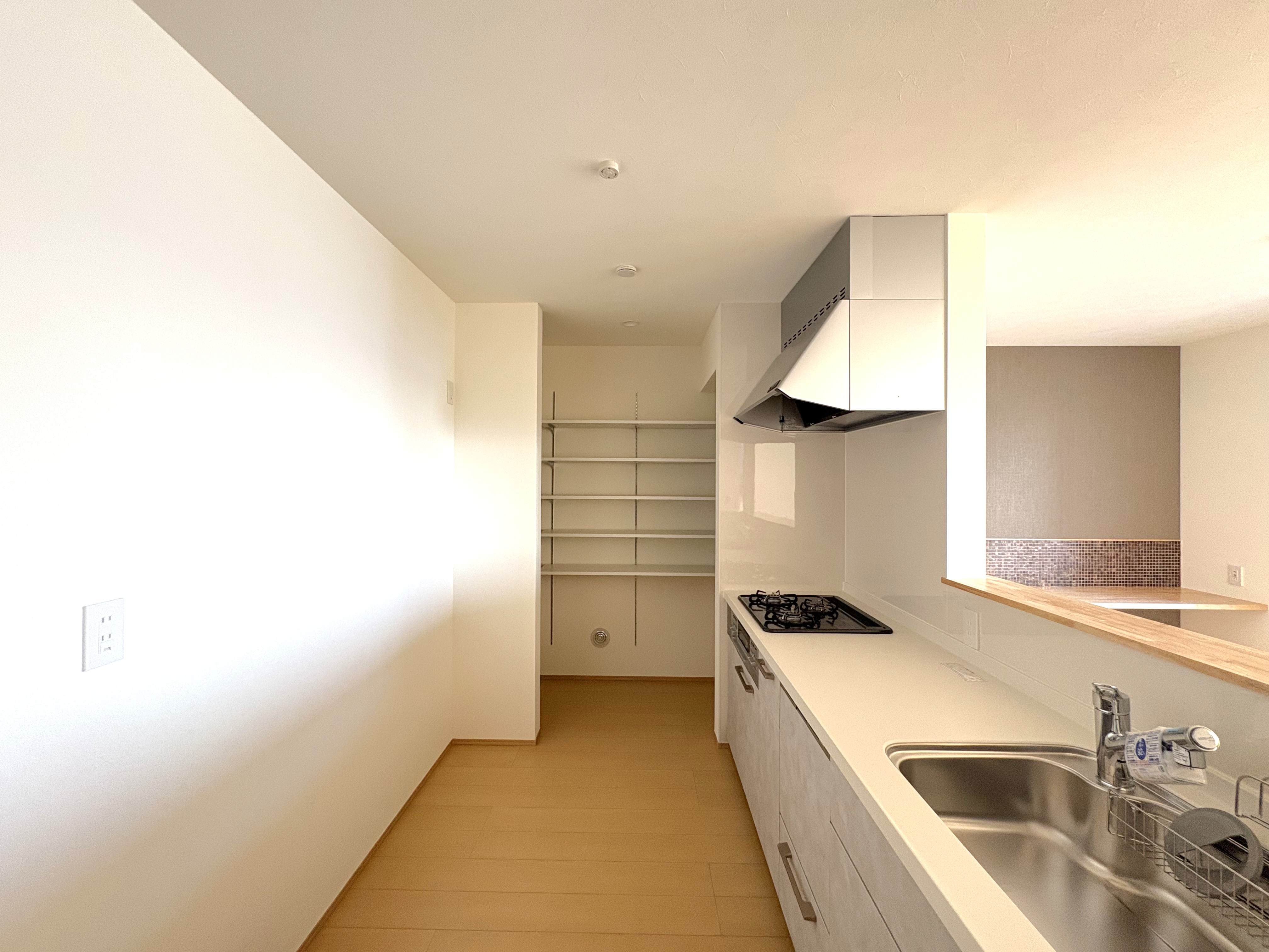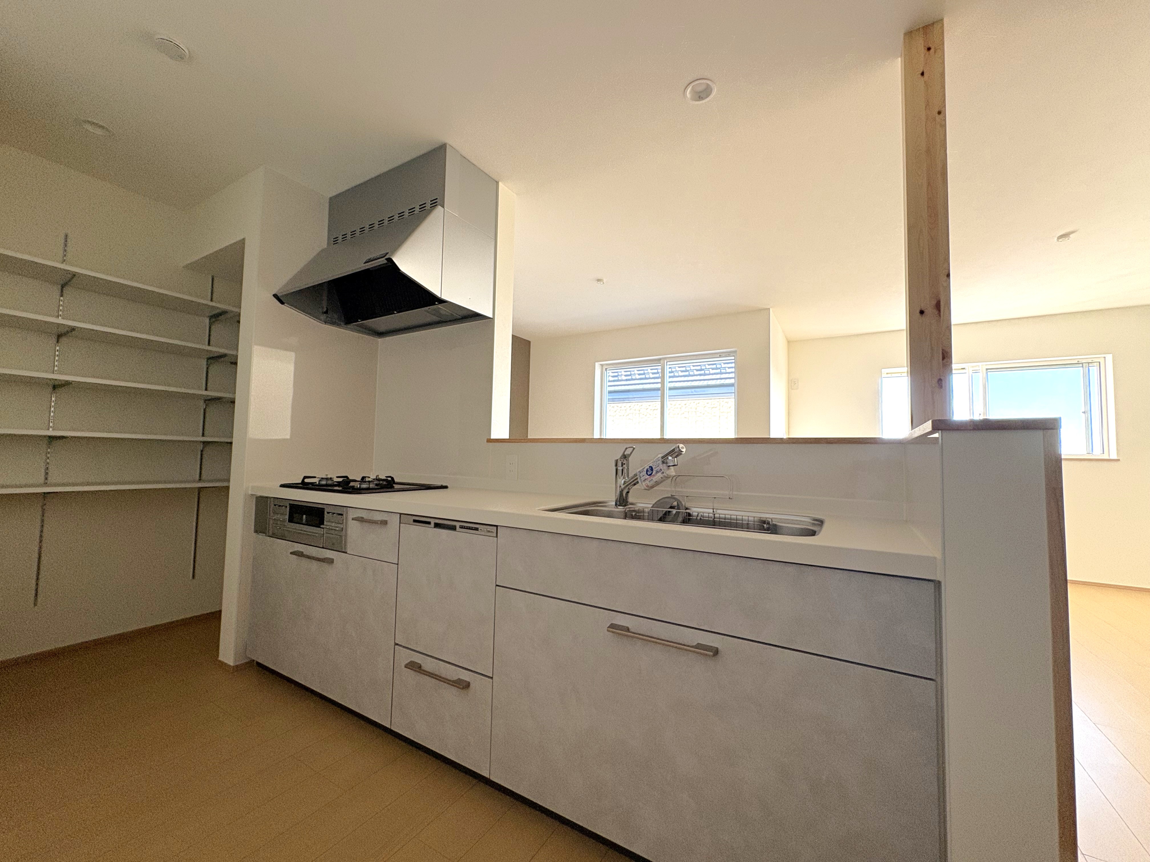 システムキッチンは食洗器付で、キッチン奥にはパントリー。