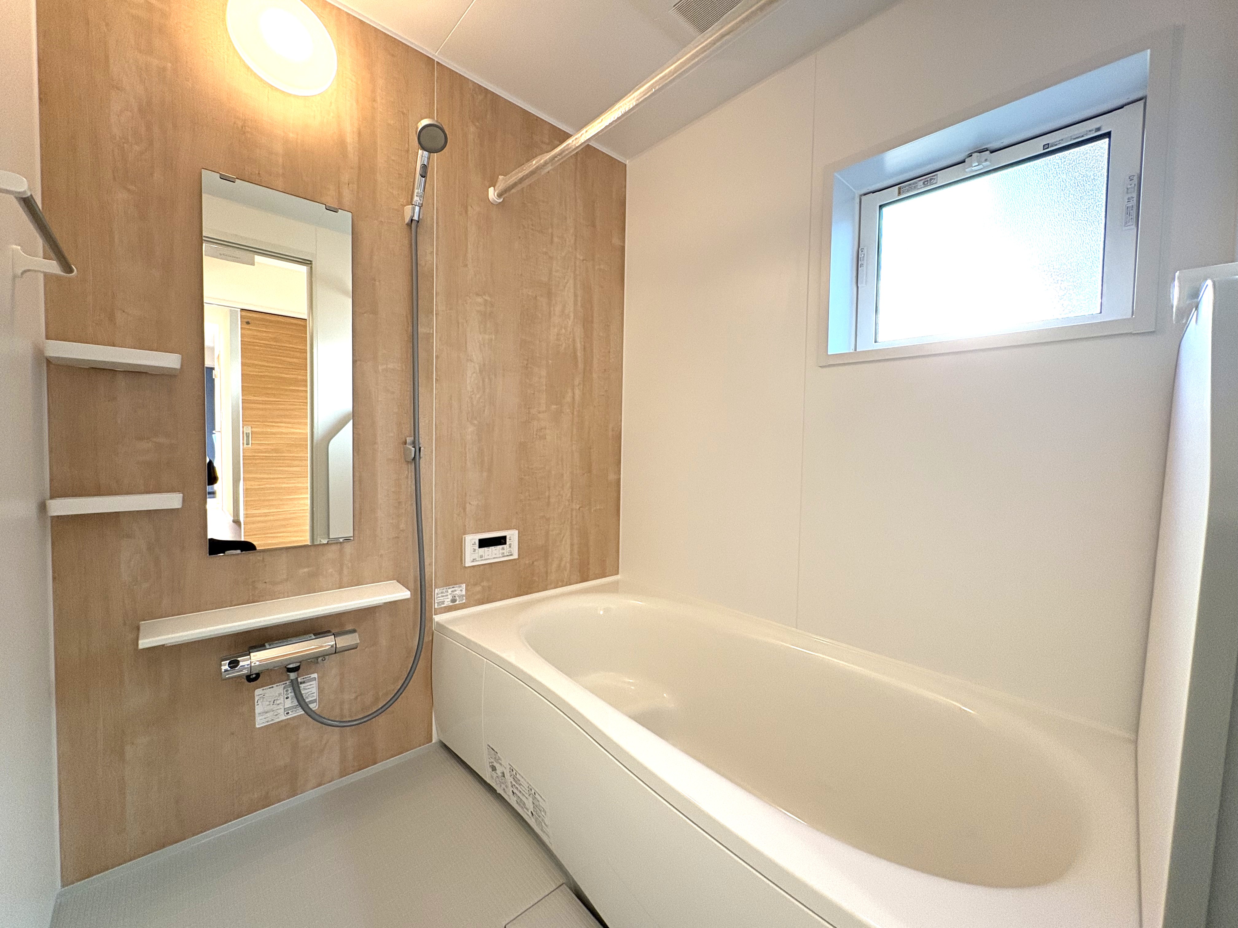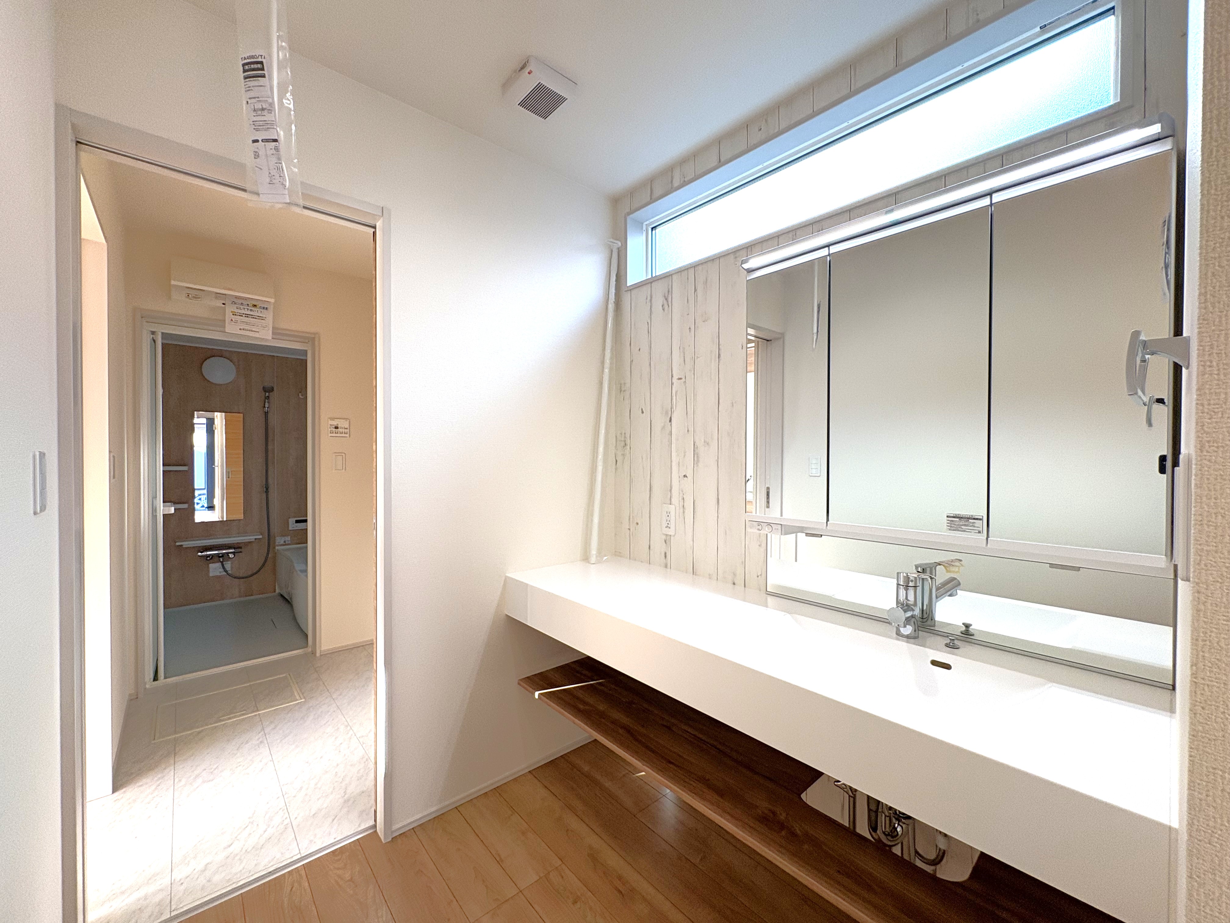 洗面化粧台はワイドカウンターでバスルームは浴室乾燥暖房機能付きです。
