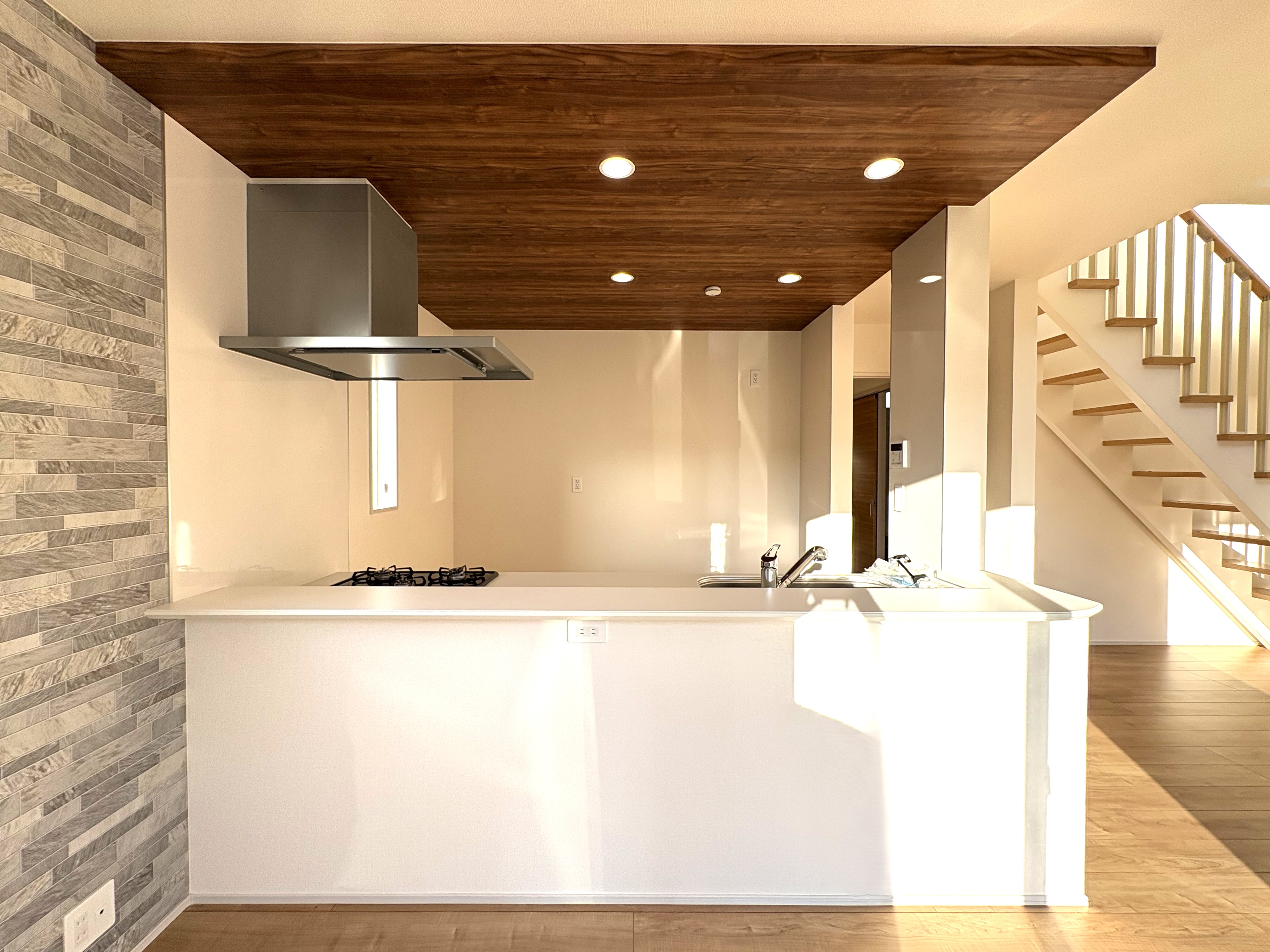 キッチン上部は折り下げ天井のアクセントクロスがあしらわれています。