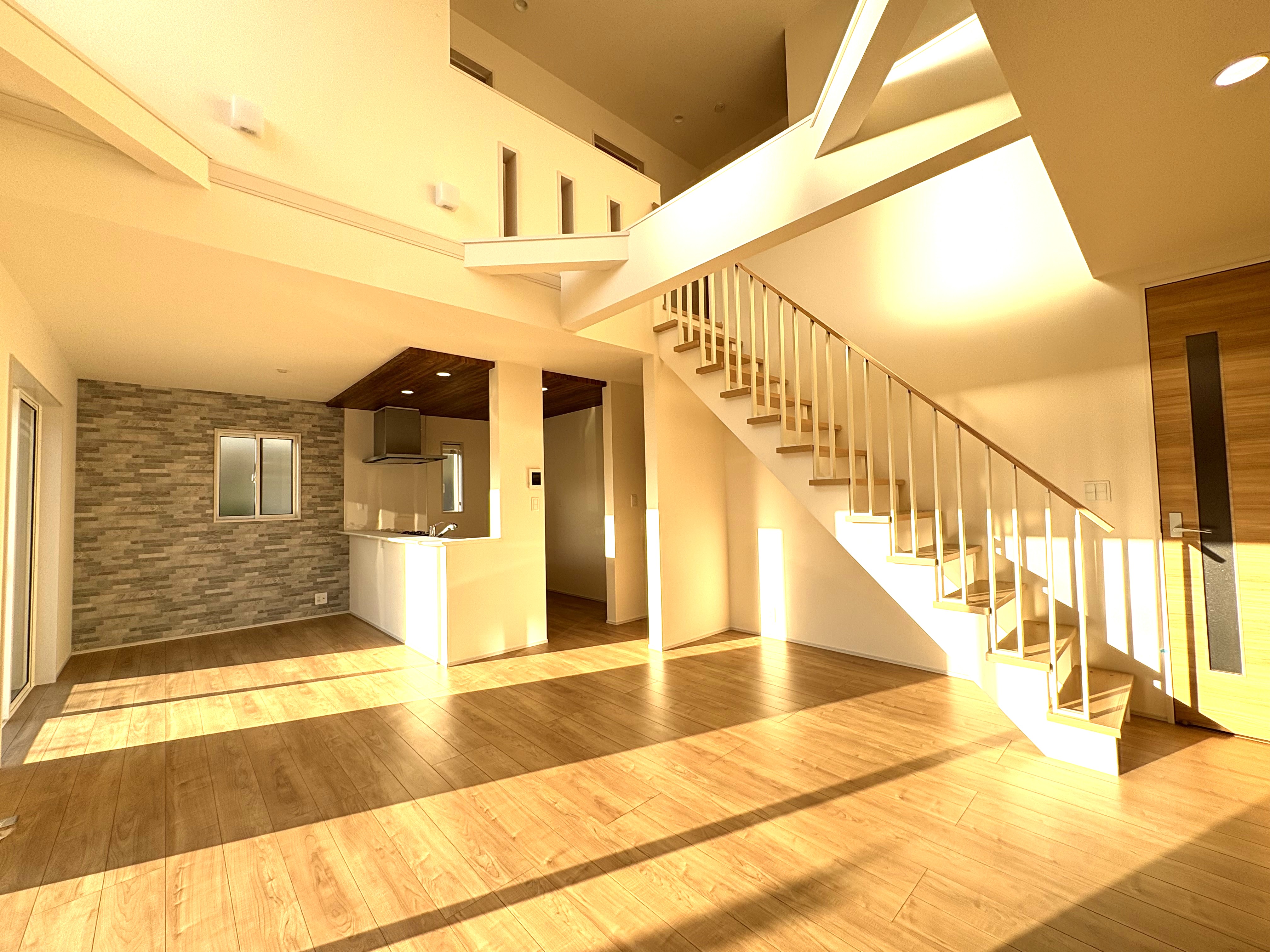 リビングには吹抜けと大型の掃き出し窓で開放感たっぷり。
