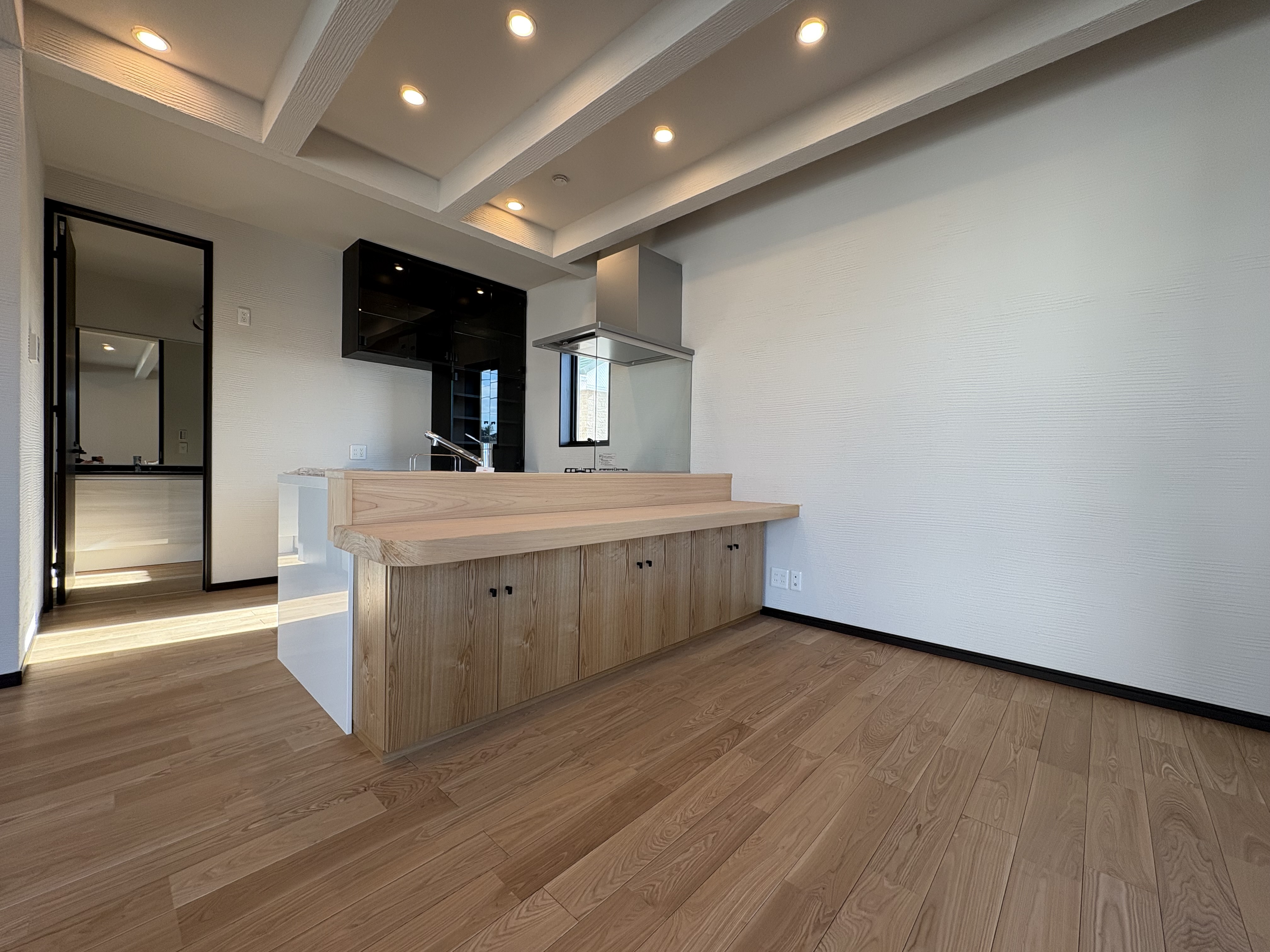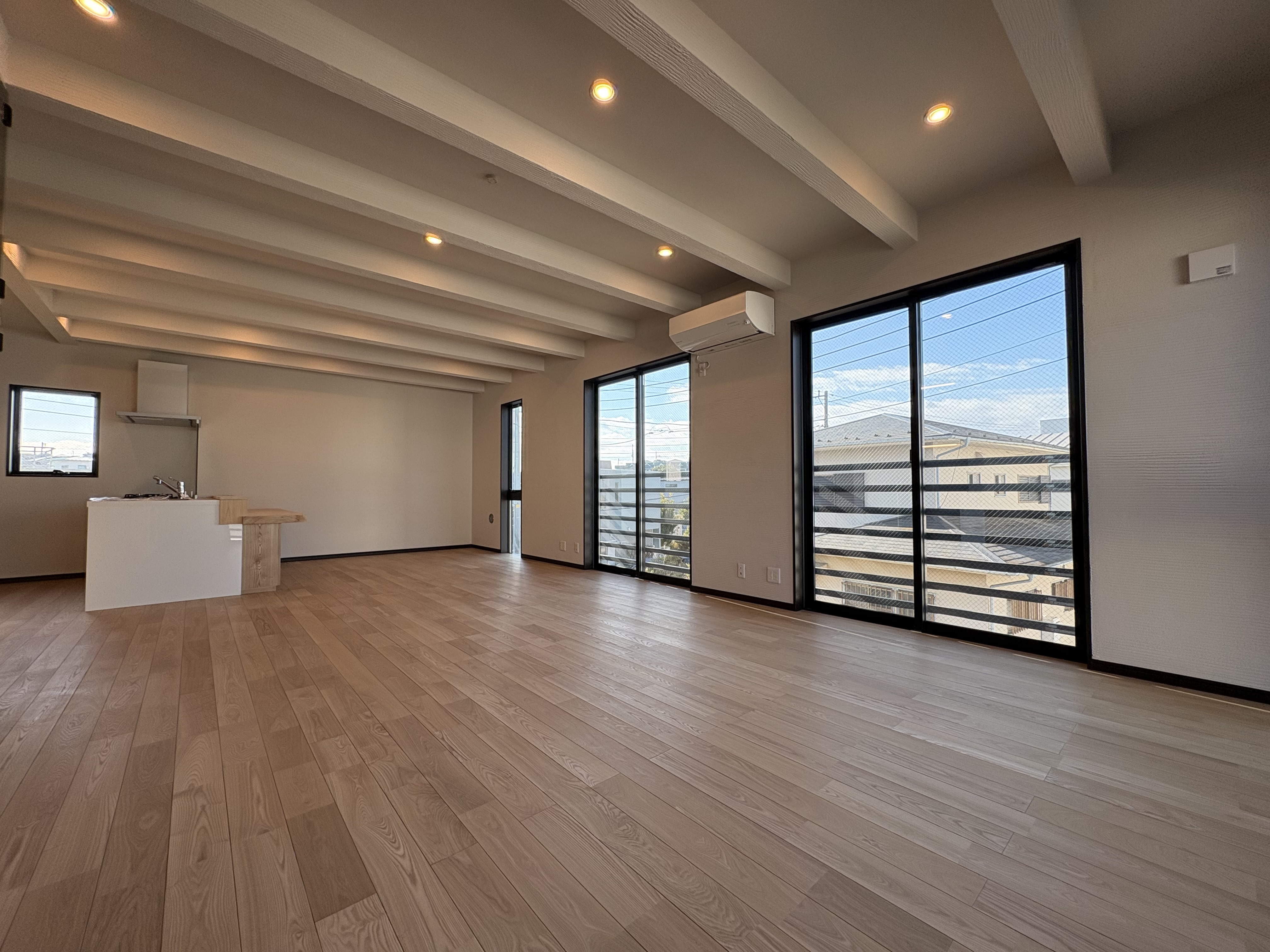 2階へ上がると、26.87帖もの広さを誇る大型LDKが広がります。対面式のキッチンカウンターを備えており、家族やゲストとの会話を楽しみながら料理ができる設計です。 三方向から光が差し込む明るいリビングは、日々の暮らしに開放感と安らぎをもたらしてくれるでしょう。