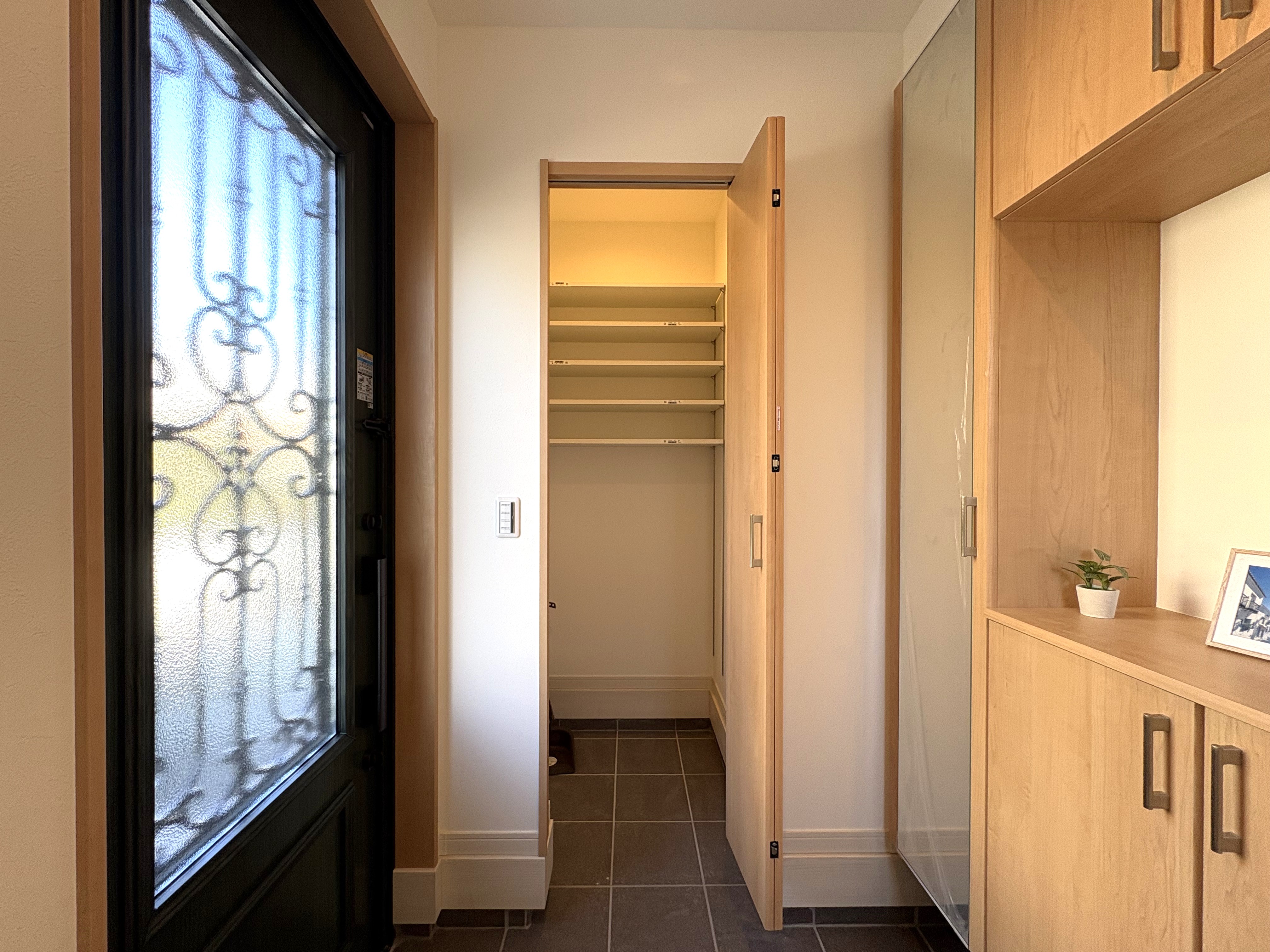 室内に入ると、玄関には便利なシューズインクローゼットがあり、すっきりとした空間を保てます。