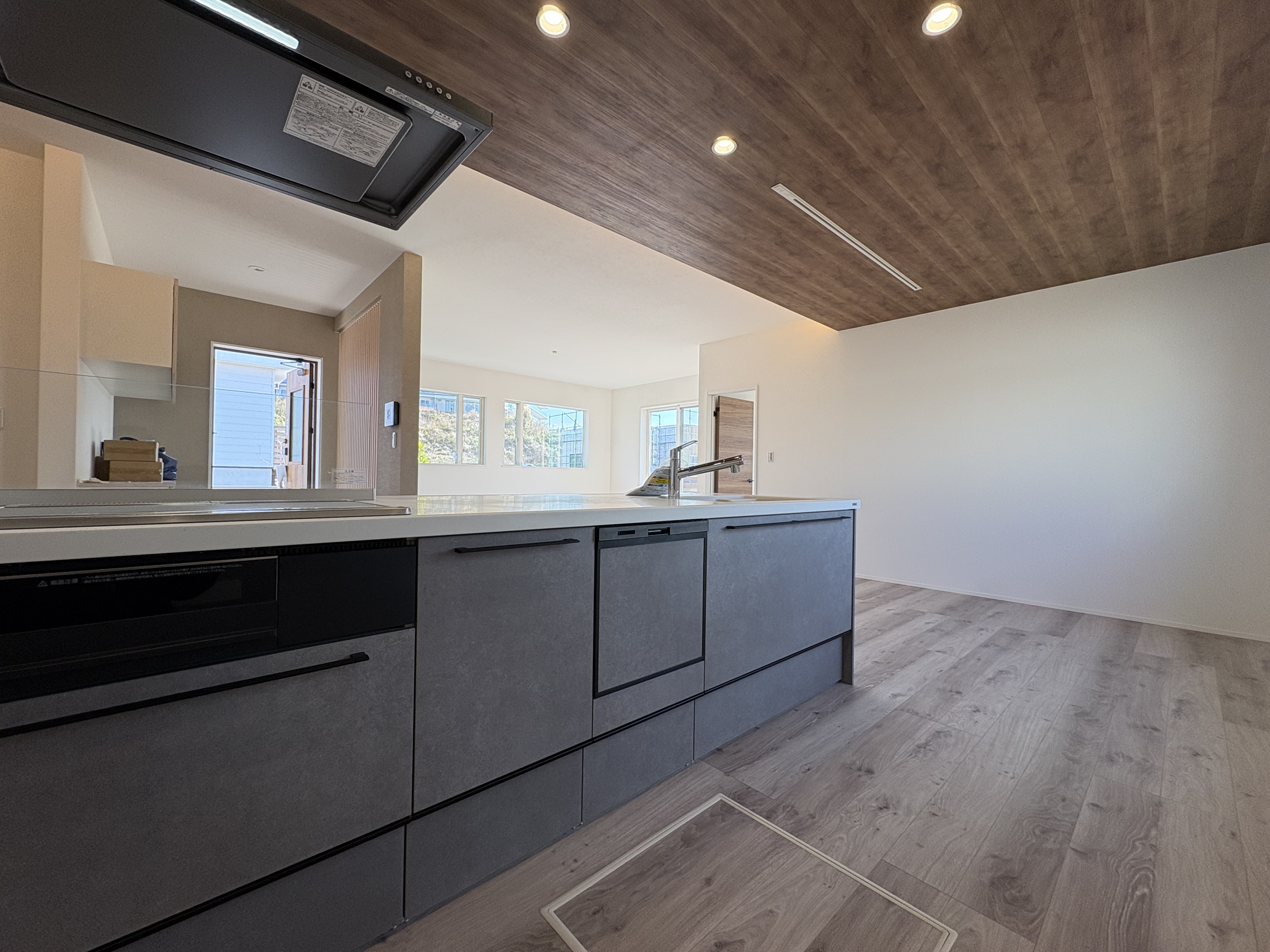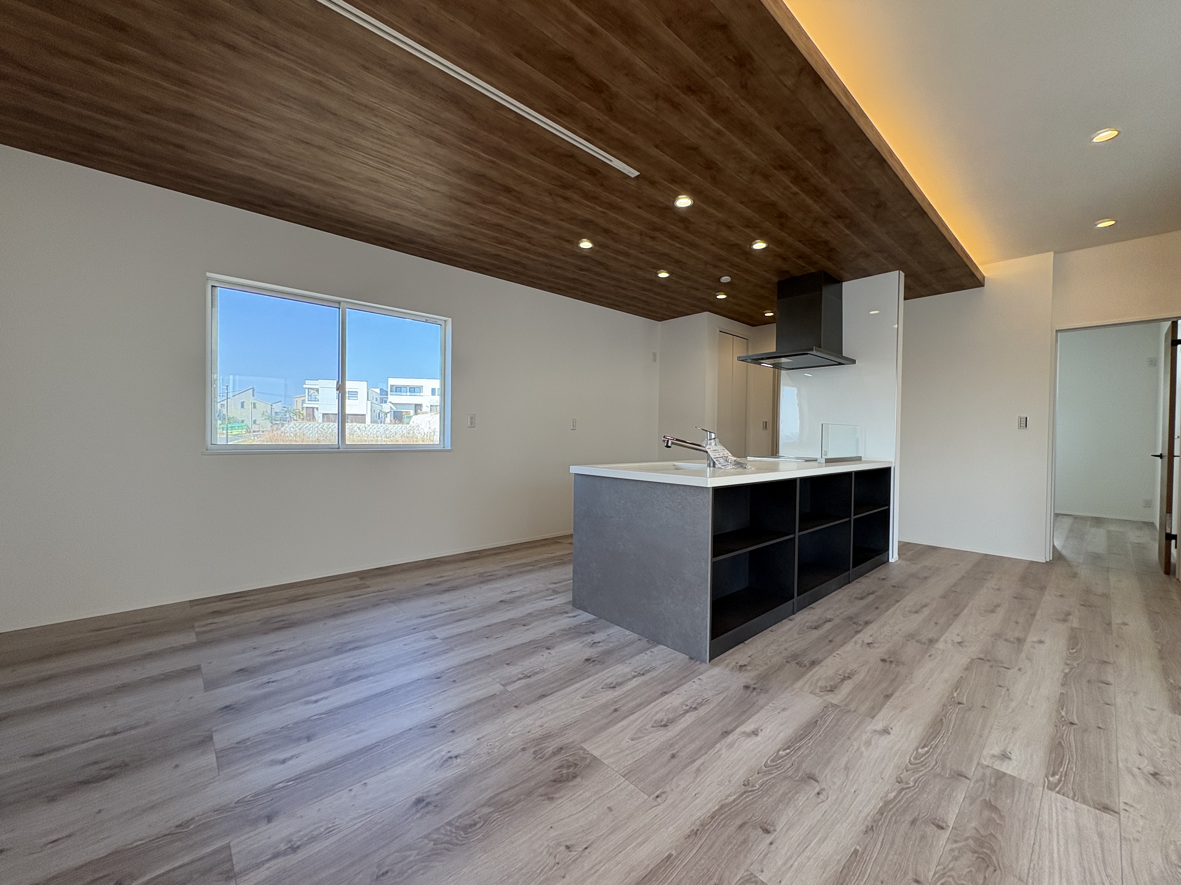 回遊動線を意識したアイランドタイプのキッチンを採用し、室内に奥行きを演出しています。