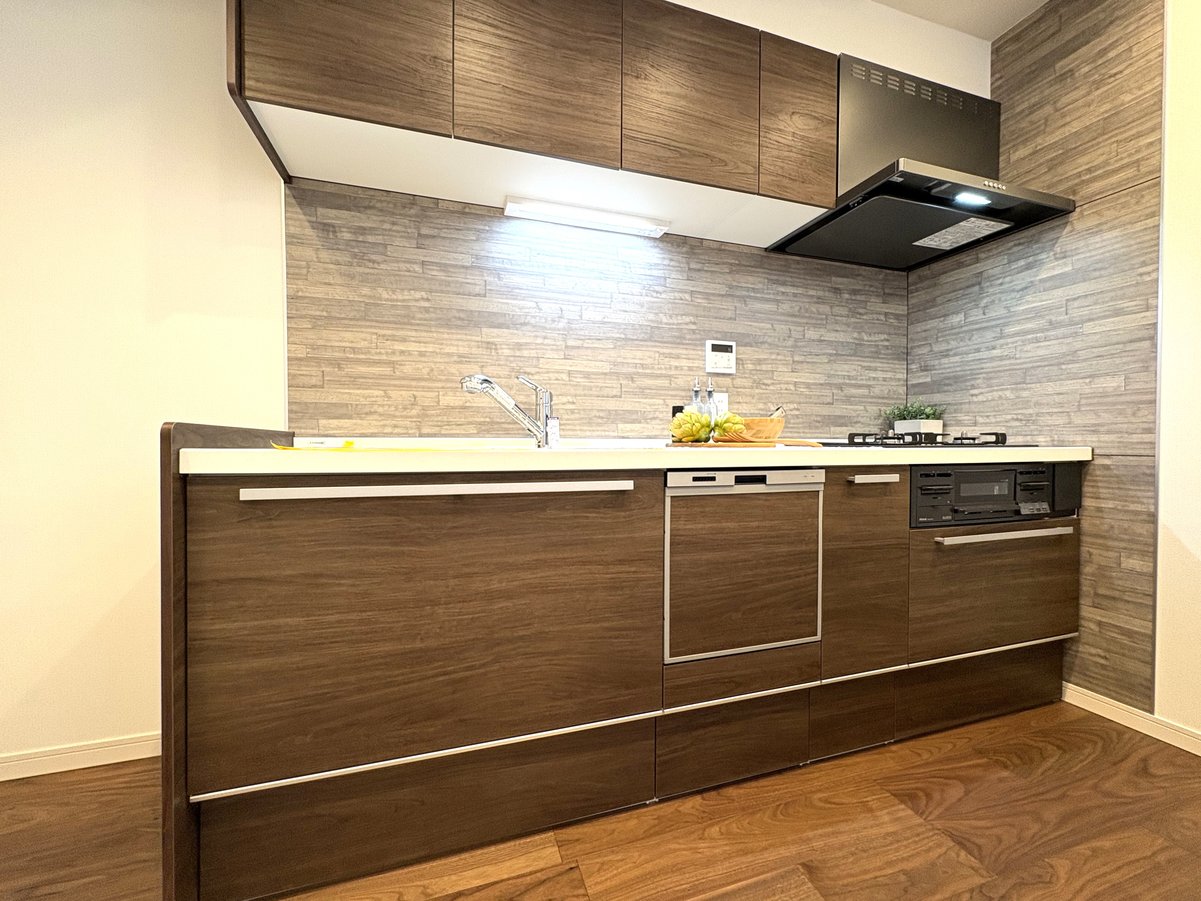 キッチンは壁付システムキッチンで背面にカウンターがあり、