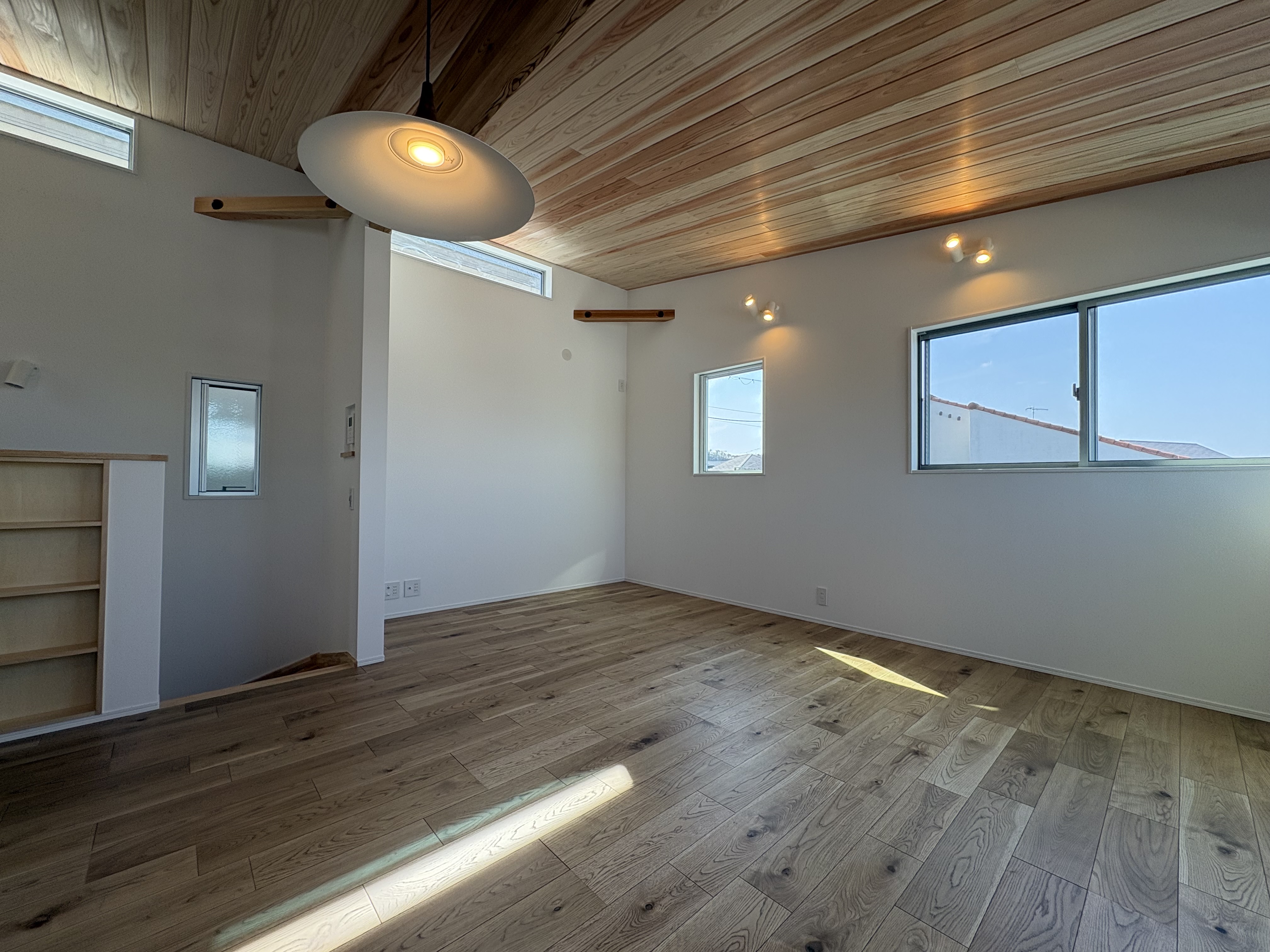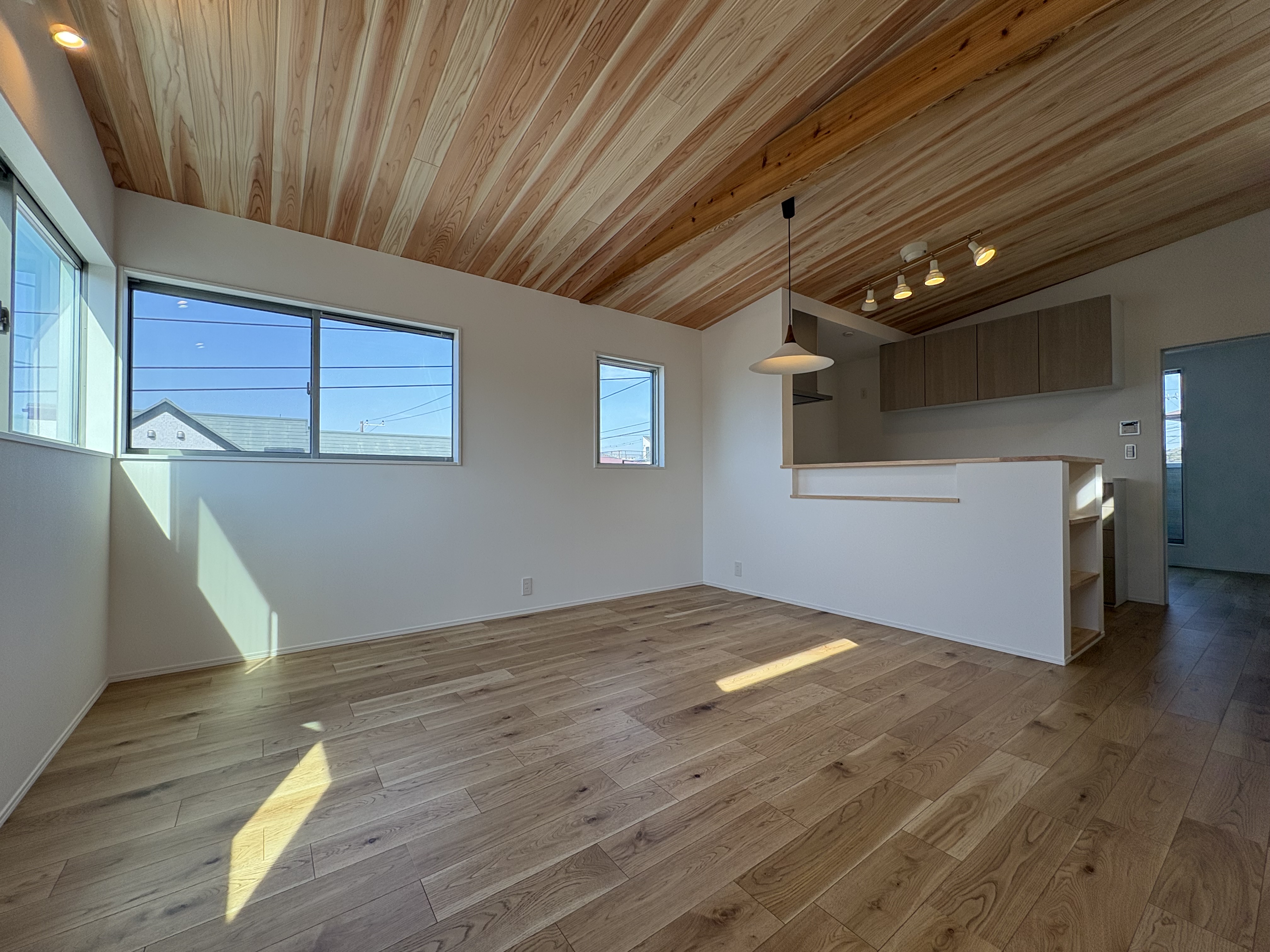 室内は、リビングの化粧梁や勾配天井、そして無垢の杉板張りを採用した天井など、木の質感に包まれた上質な空間設計となっています。構造材には愛媛県産の無垢ひのき柱を使用し、住まいの根幹から品質を大切にしています。