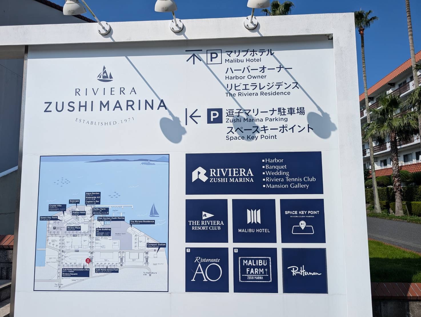 リゾート感たっぷりの逗子マリーナ、敷地内には英語の標識やヨットハーバーなど、