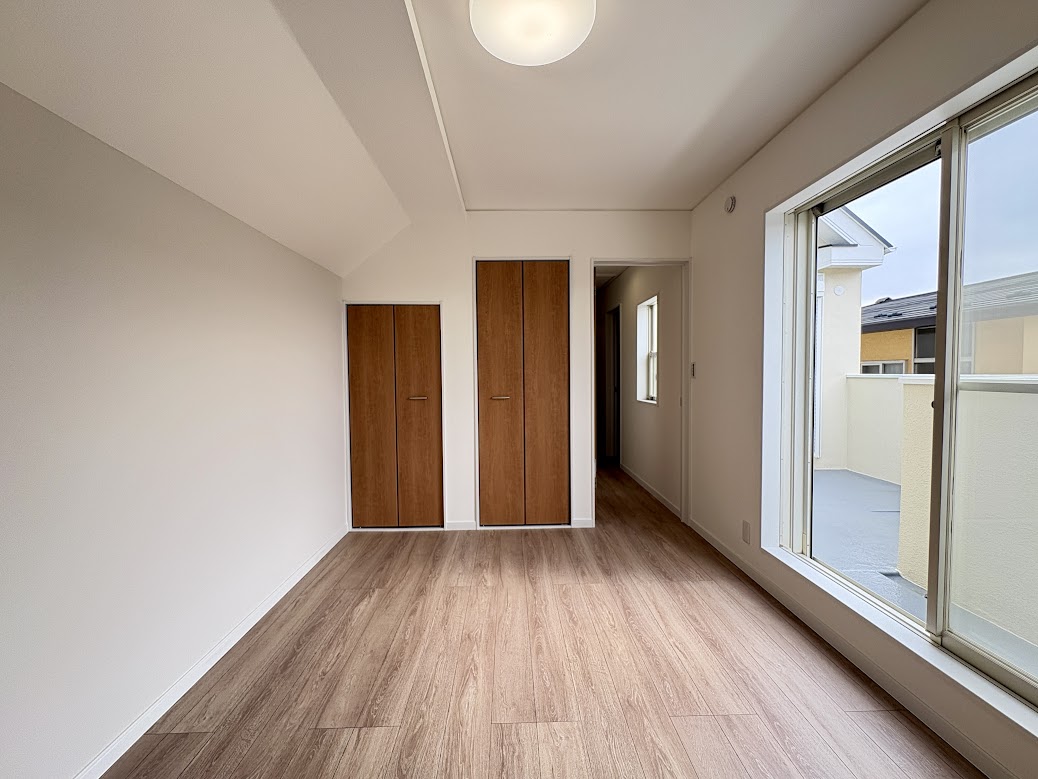 開放的な空間構成: 前面道路が広く車庫入れも楽々。明るい陽光が差し込む2階洋室や、落ち着きある1階和室など、風通しの良さが自慢です。