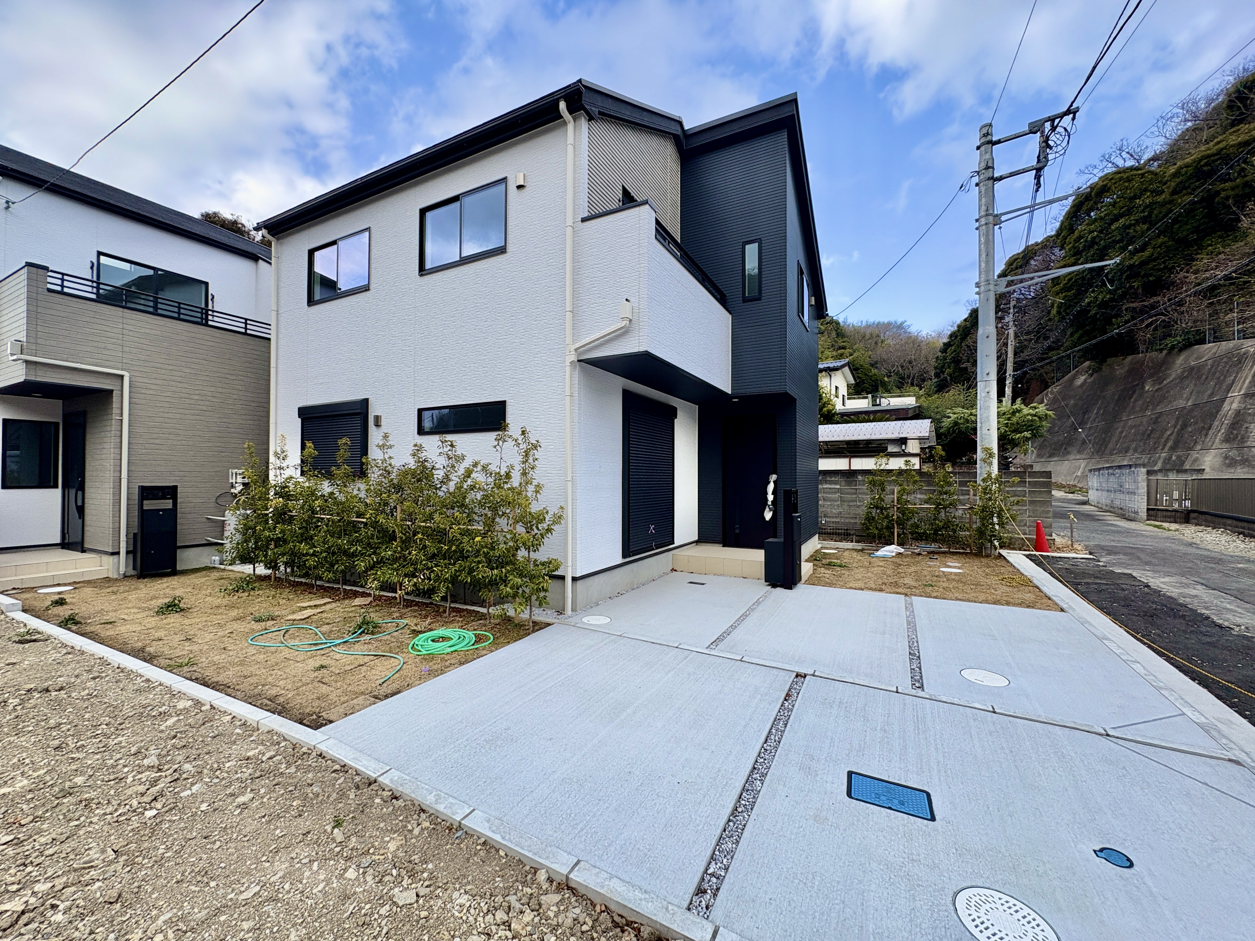 高速の逗子インターから車で3分の所に、おすすめの新築が登場しました。写真の通り室内外はお洒落に設計されており、スタイリッシュな設えになっています♪