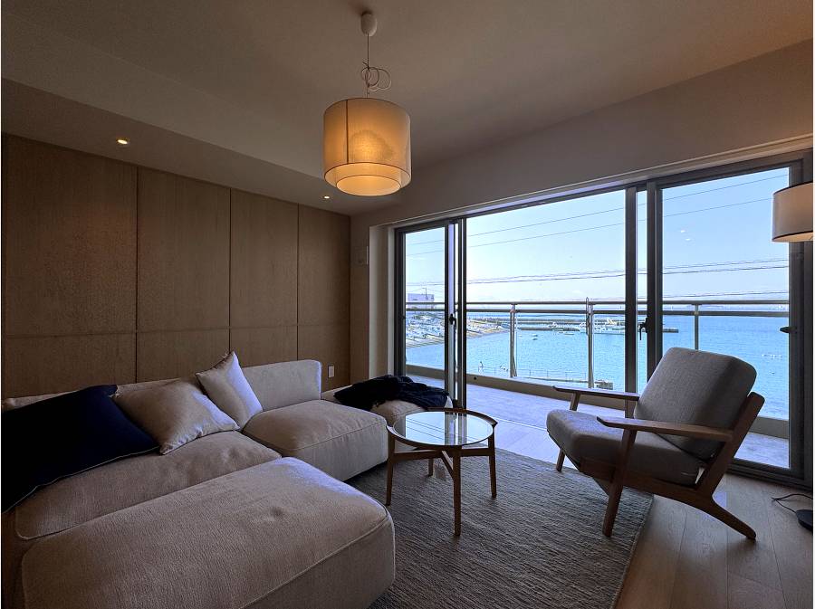 約25帖もの開放的なLDKに足を踏み入れると、バルコニー越しに水平線が広がり、室内にいながらにして波の音を感じるような設計となっております。