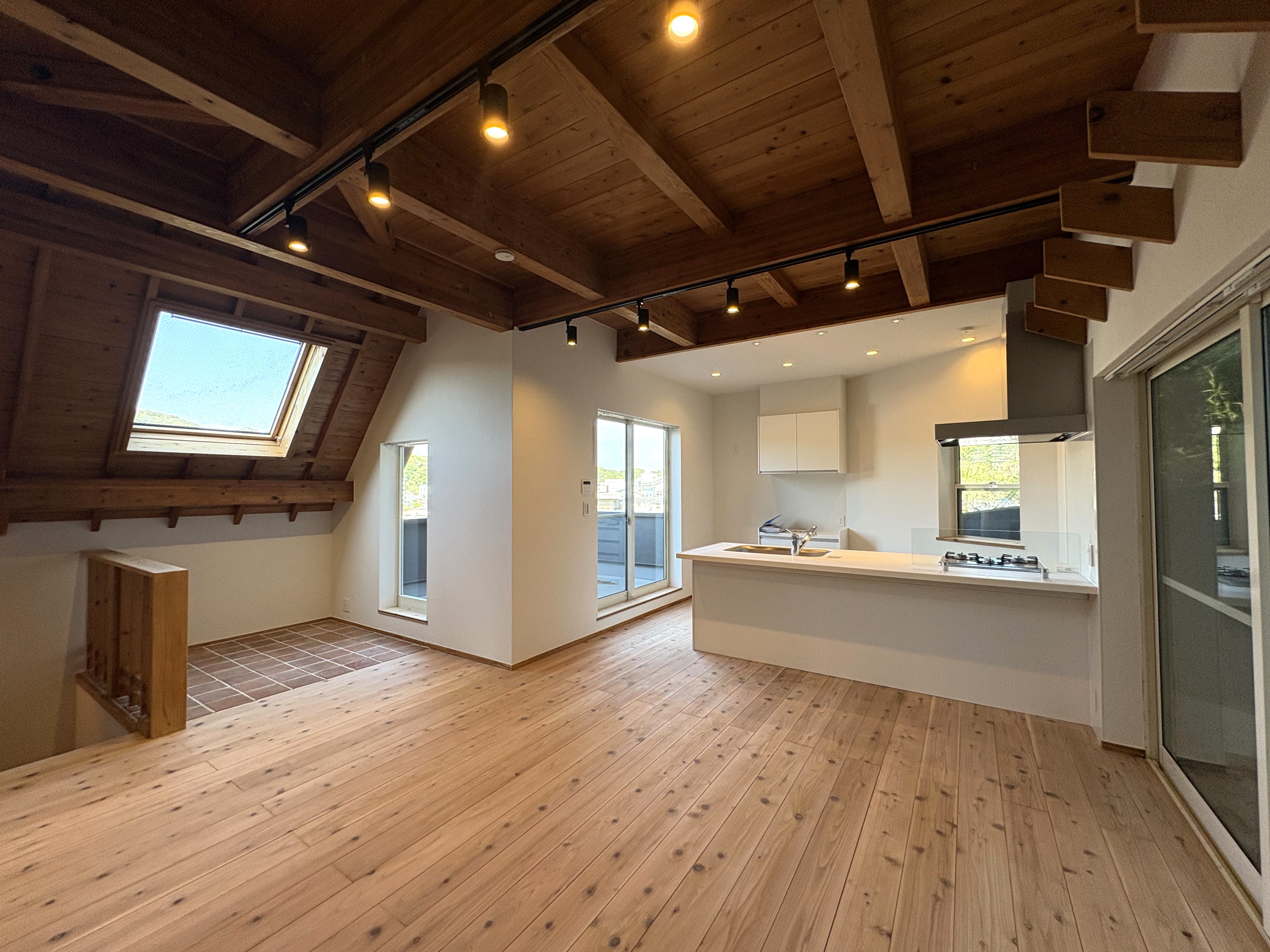 2階に配置された約19.7帖のLDKは、高台ならではの光を採り込む大きな窓と、勾配天井を活かした開放感あふれる空間となっています。